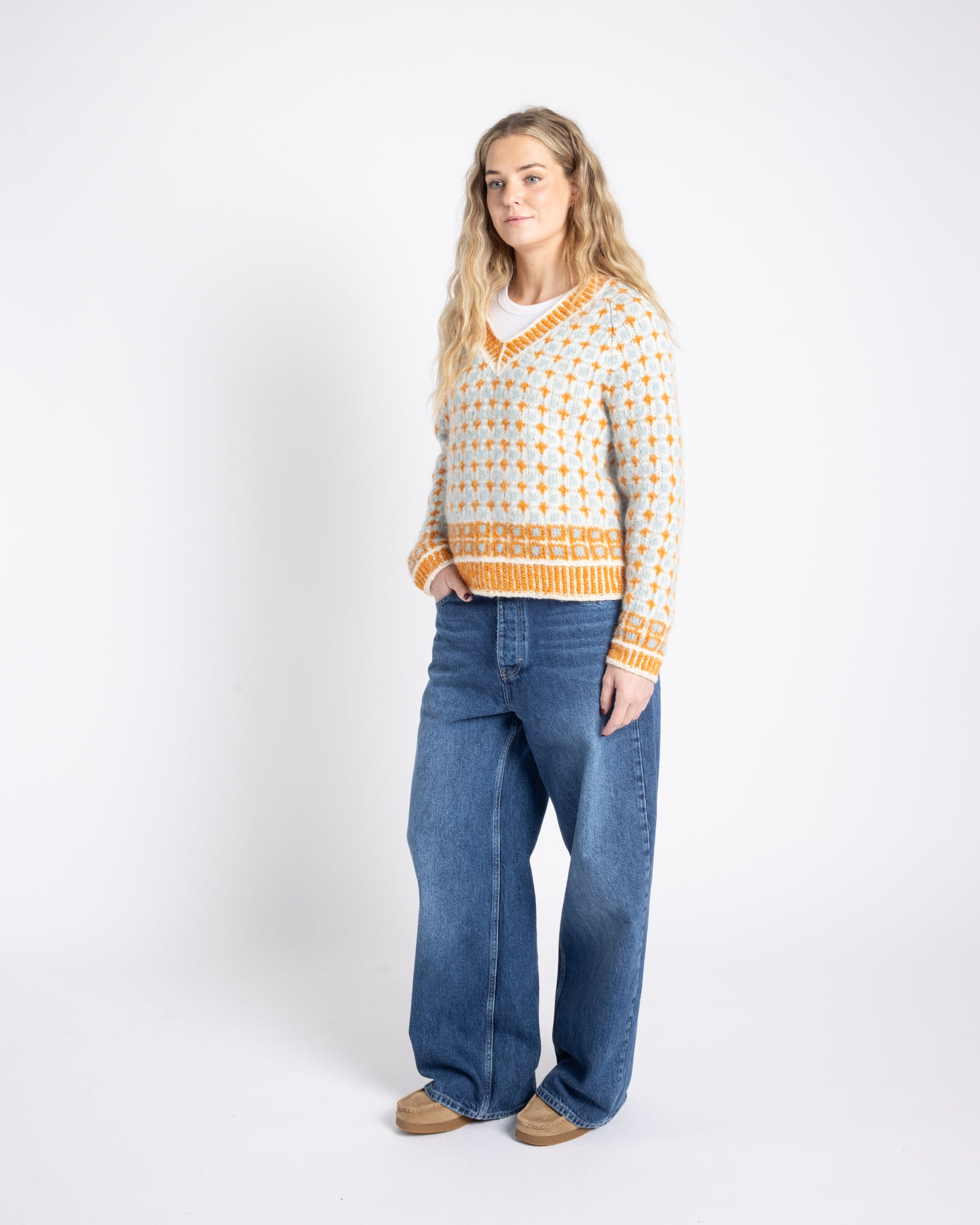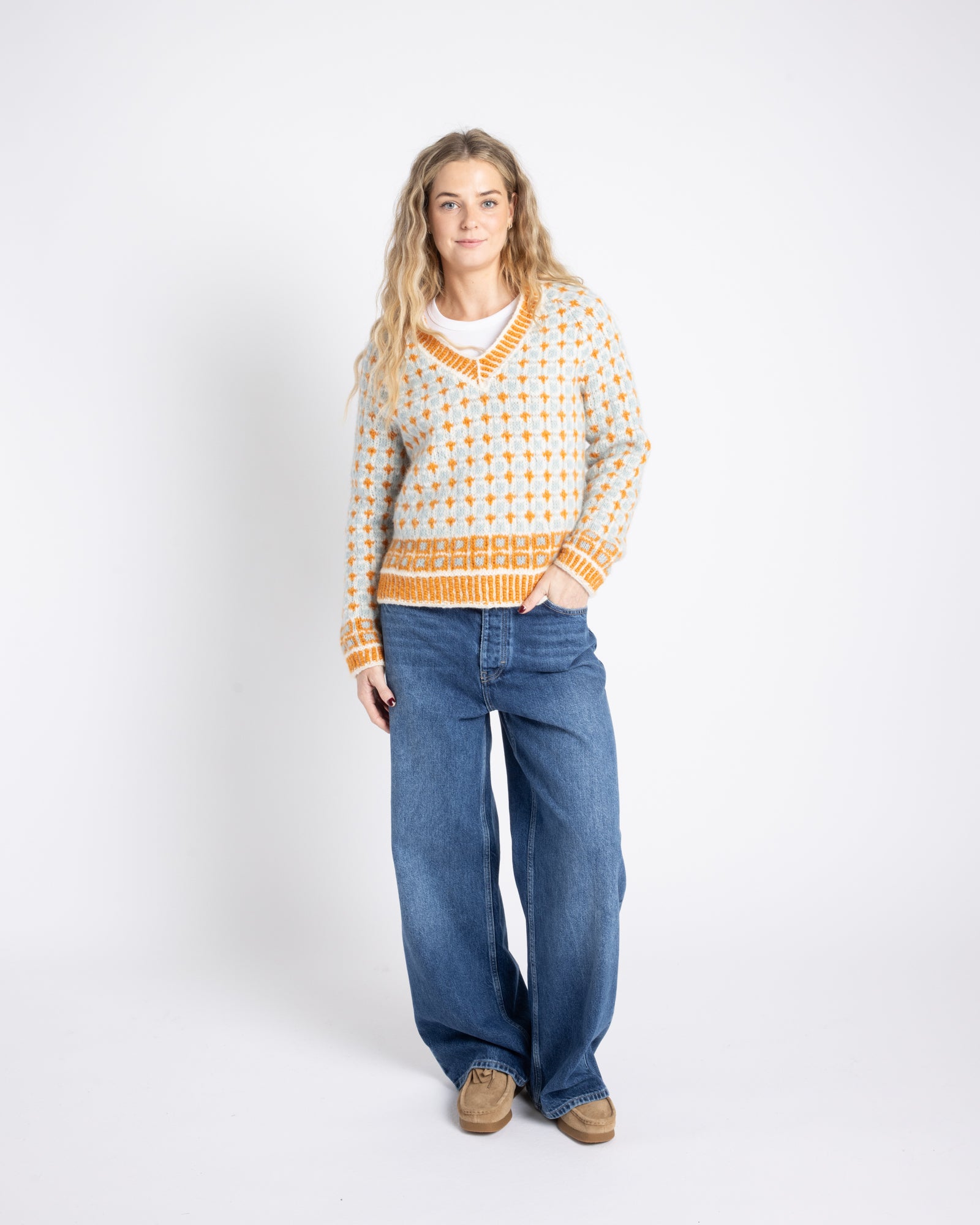 Bris means Breeze and is a boxy fit sweater with a v-neck and a unique pattern. The bright colors and repetitive pattern makes it the perfect versatile statement sweater.