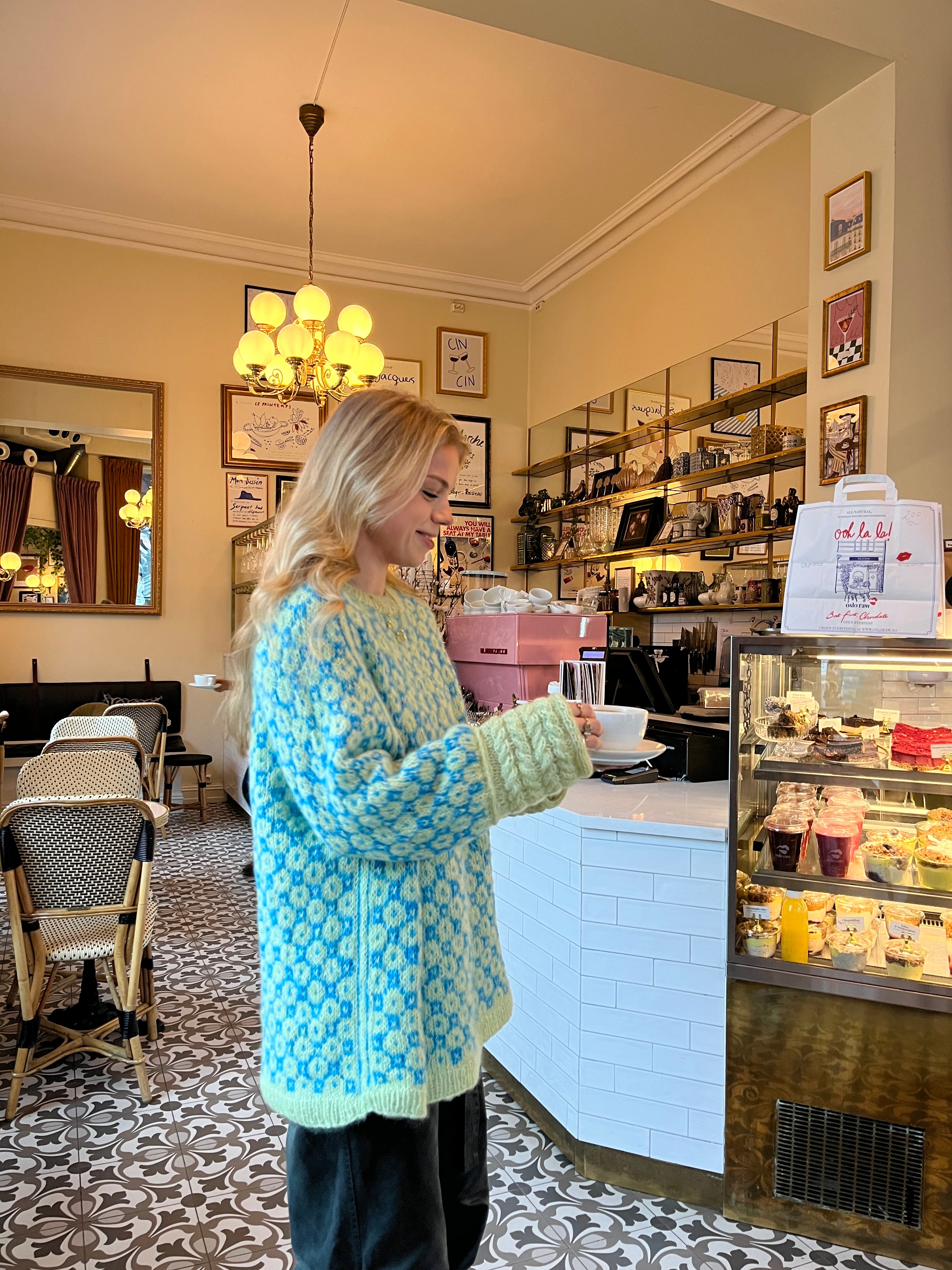The sweater is knitted in Suri Norwegian Lambswool in 1032 Pastel Green & 1036 Mediterranean Blue.