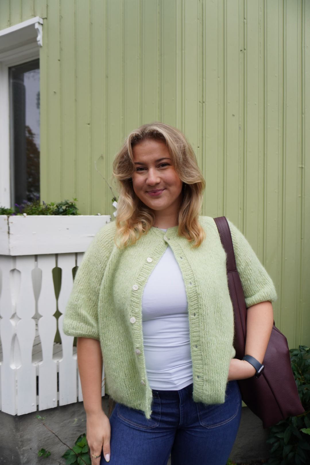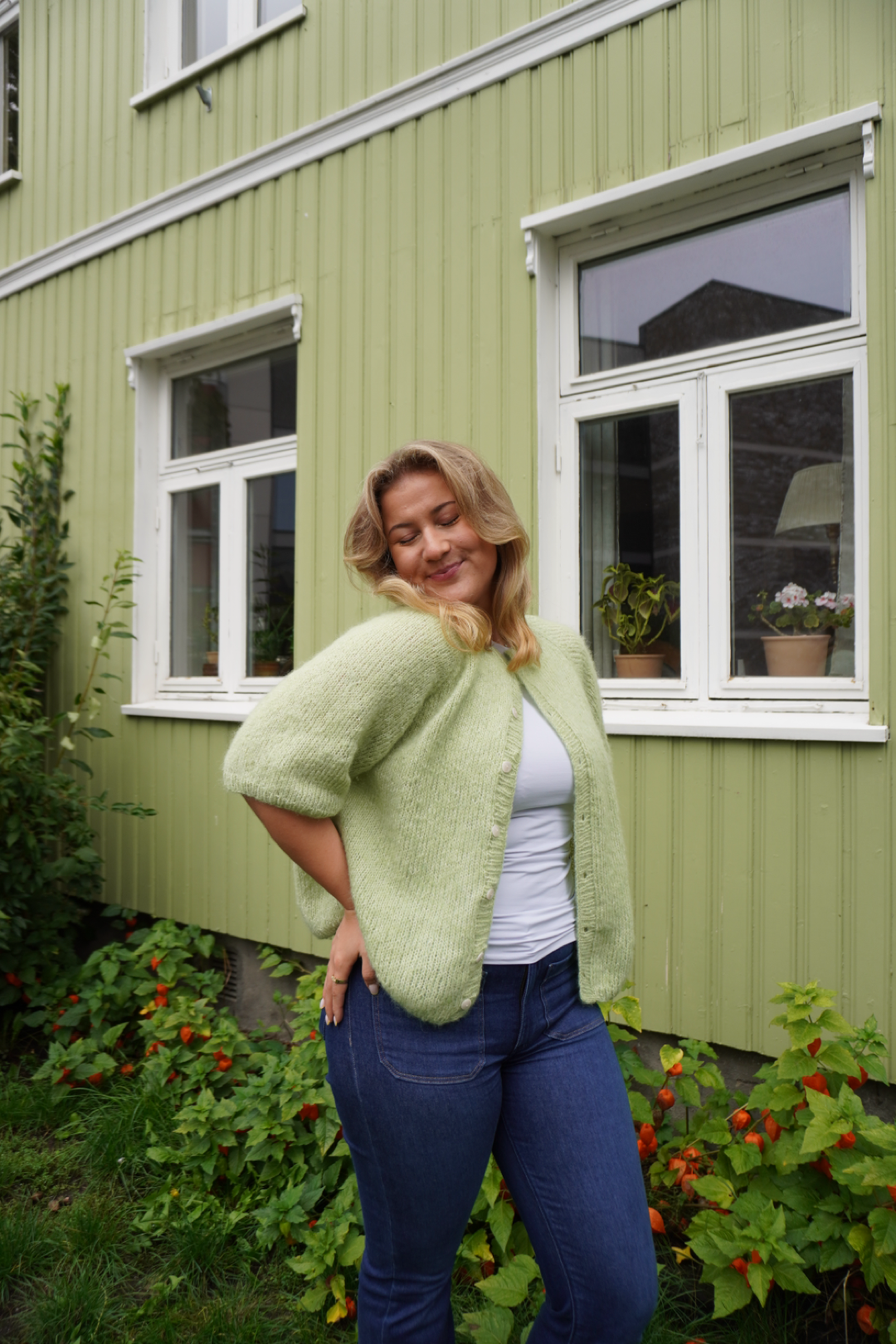 The sweater is knitted in Suri Norwegian Lambswool in 1032 Pastel Green.