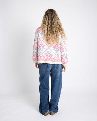 The sweater is knitted in Spinnvill Norwegian Lambswool in 5001 Natural White, 5021 Pink and 5019 Lavender.