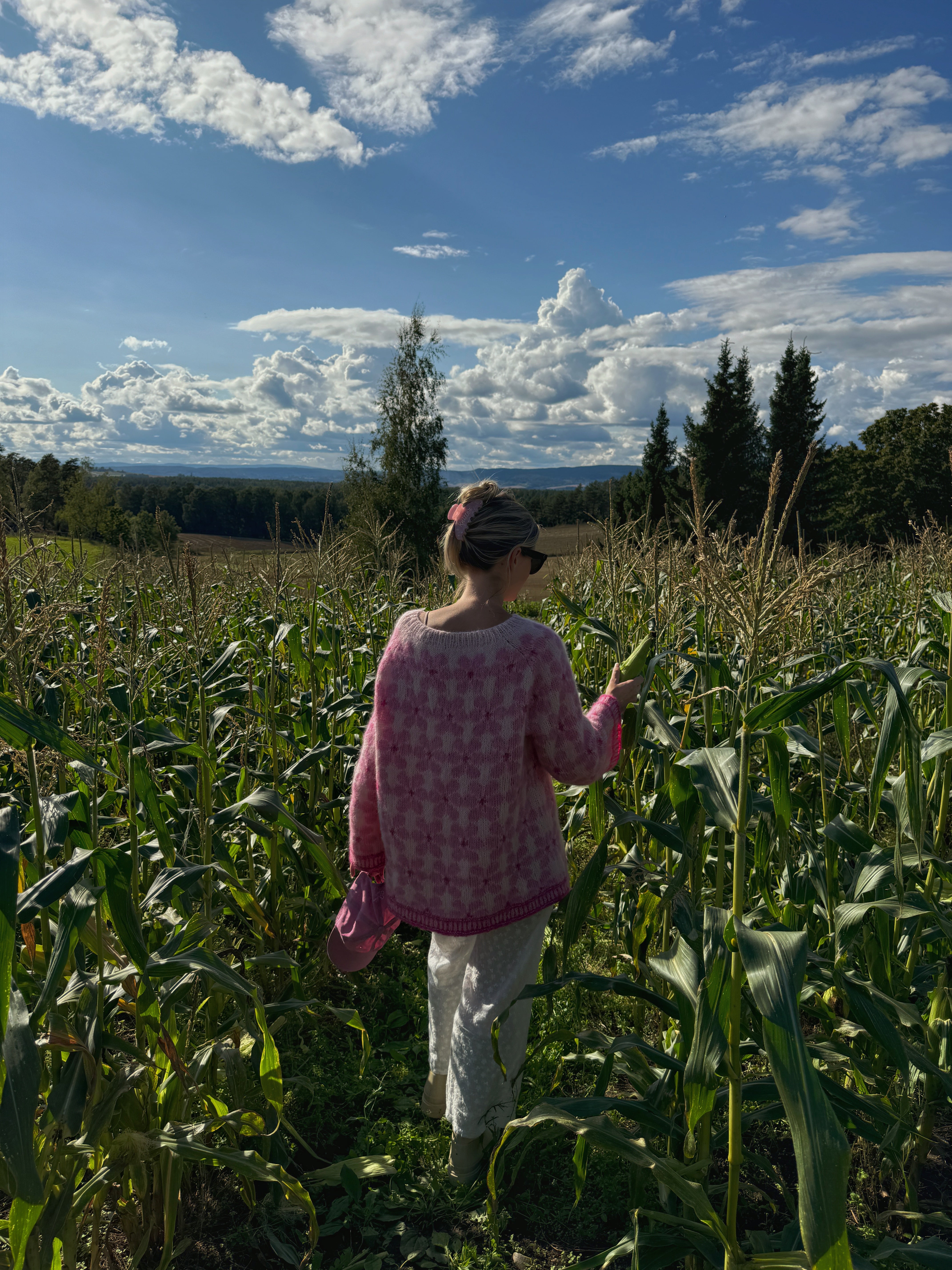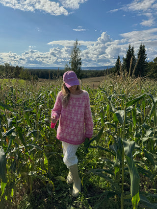 The sweater is knitted in Suri Norwegian Lambswool in 1011 Powdered Pink, 1021, Pink and 1022 Dark Pink.