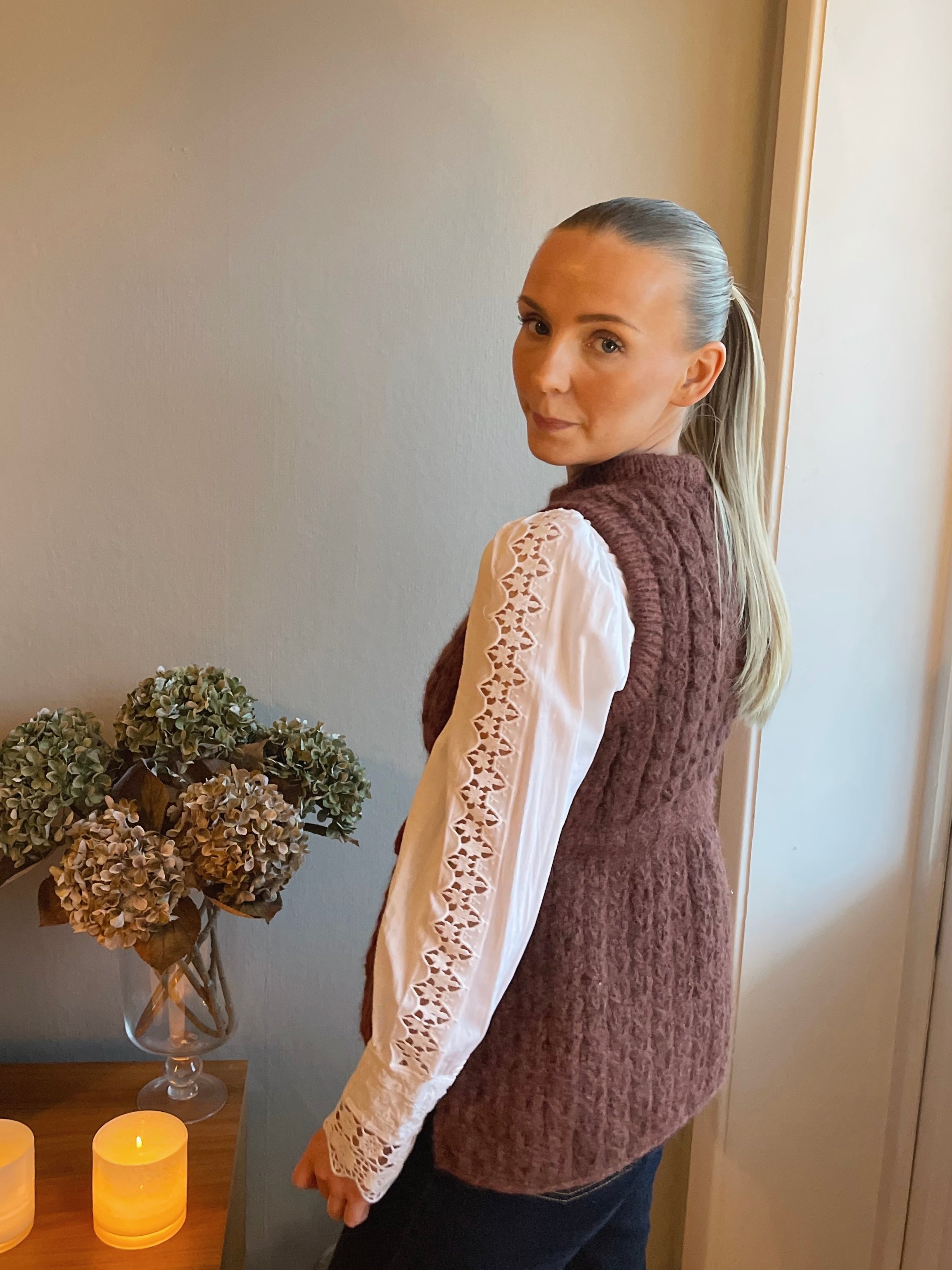 Kornblomst means Cornflower and is named after one of nature's beauties, due to its texture. I wanted to design a vest that is both cute and has a bit of an edge. I was missing a knitted garment that can elevate an outfit. The vest is cozy and warm, and perfect to wear over a shirt. A perfect statement piece. I’ll be wearing mine at the office, just the right balance of cute and edgy.