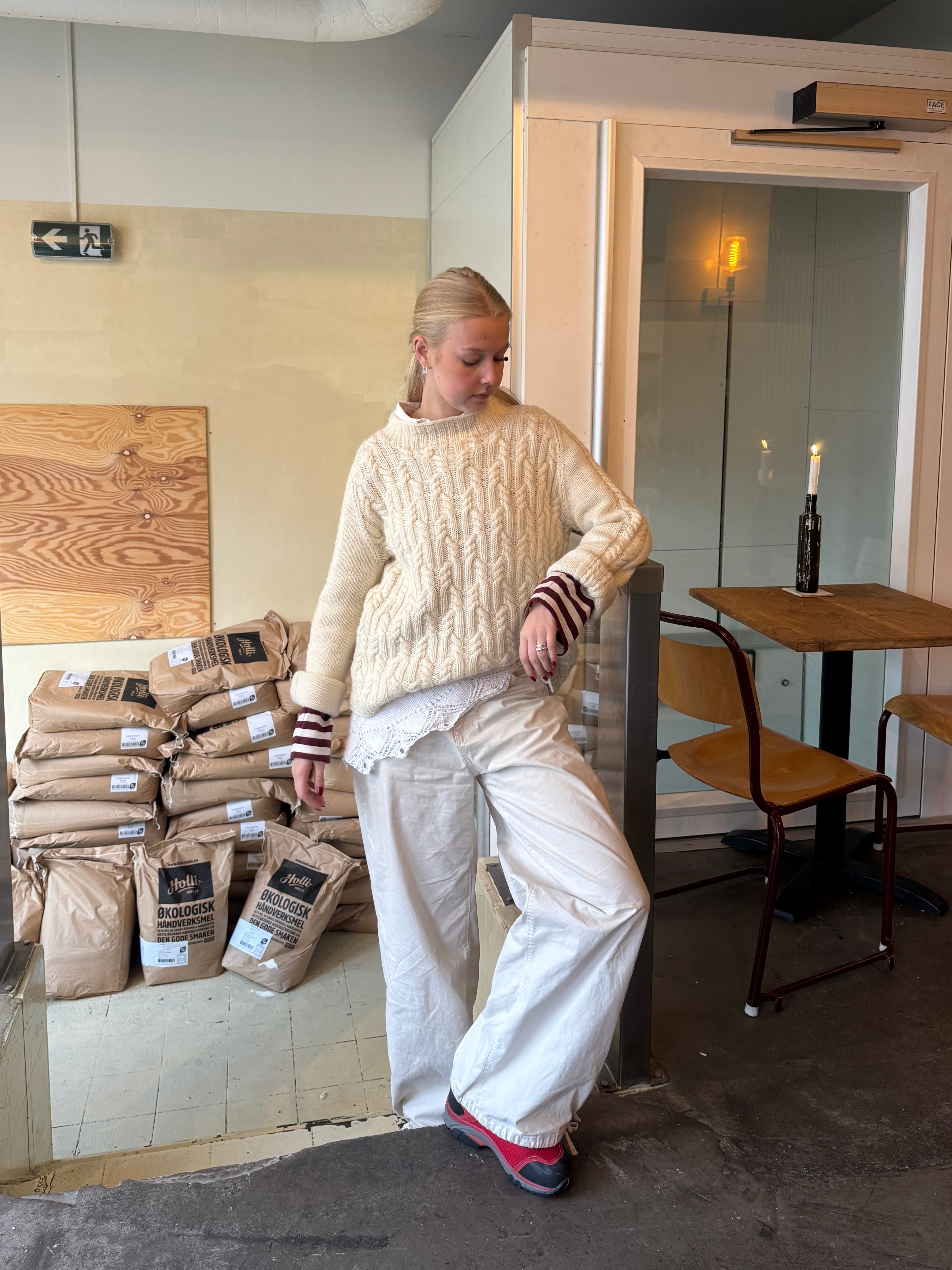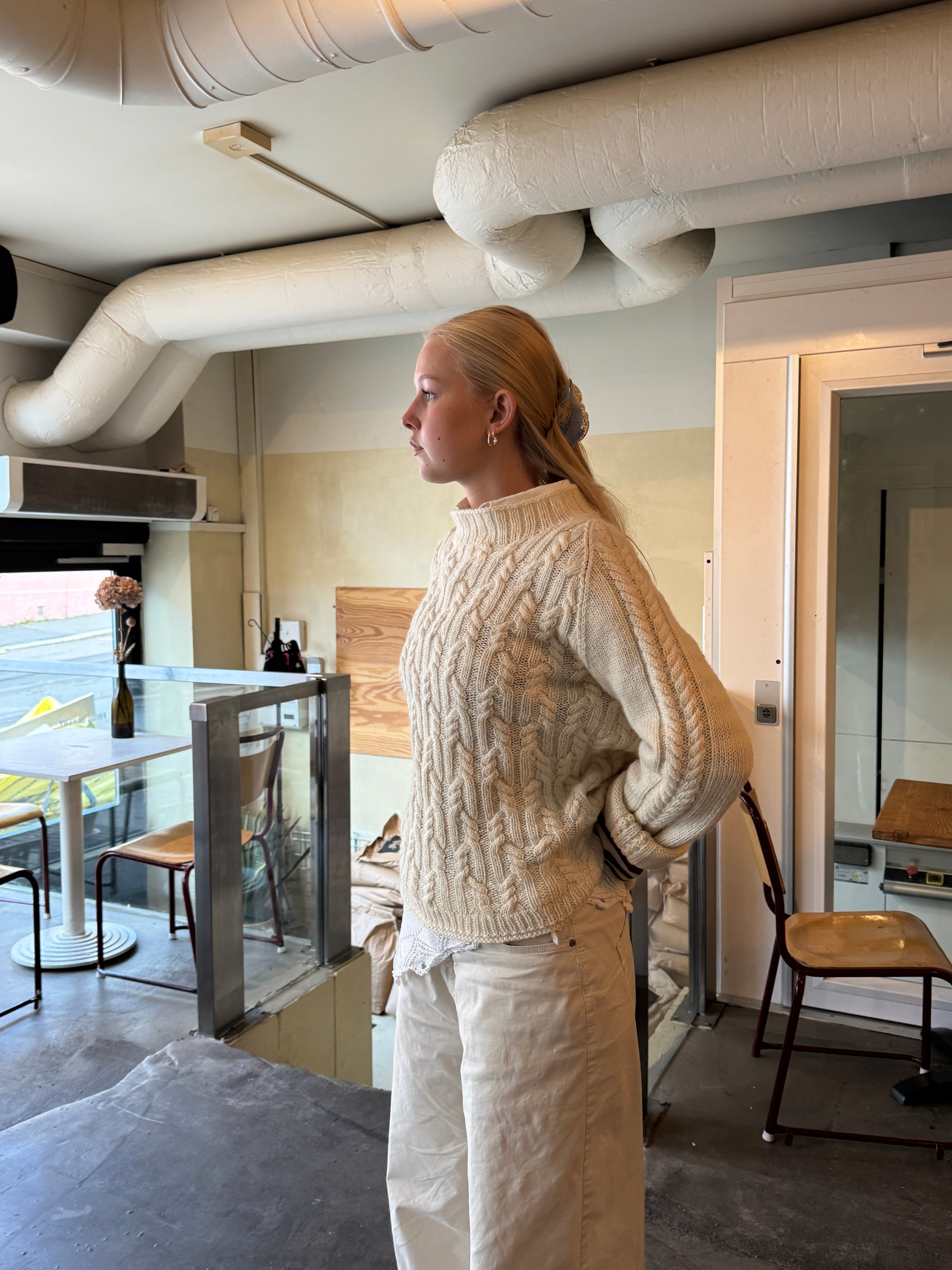 The sweater is knitted in Spinnvill Norwegian Lambswool in 5001 Natural White.