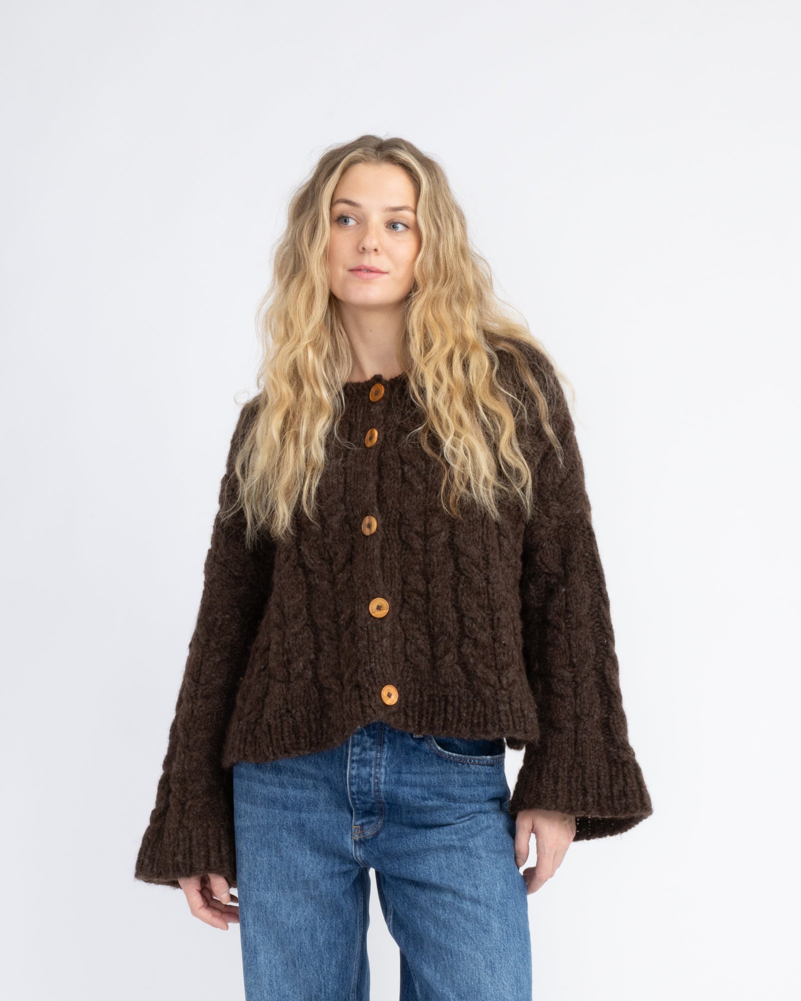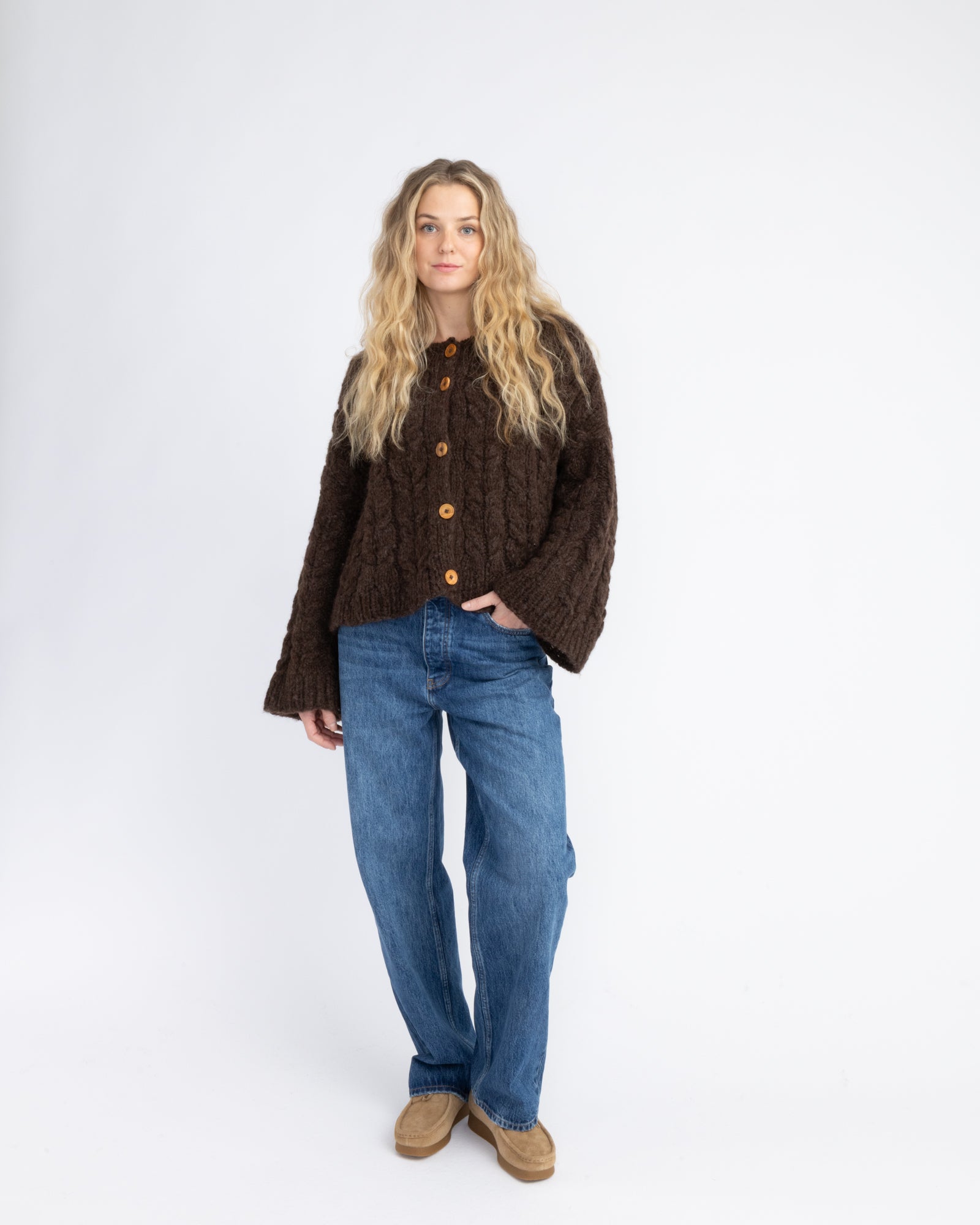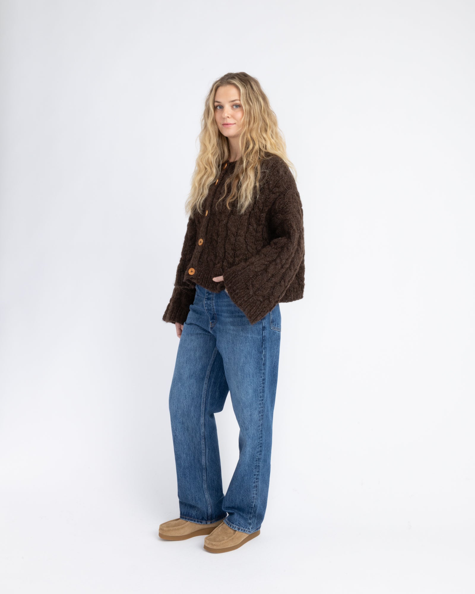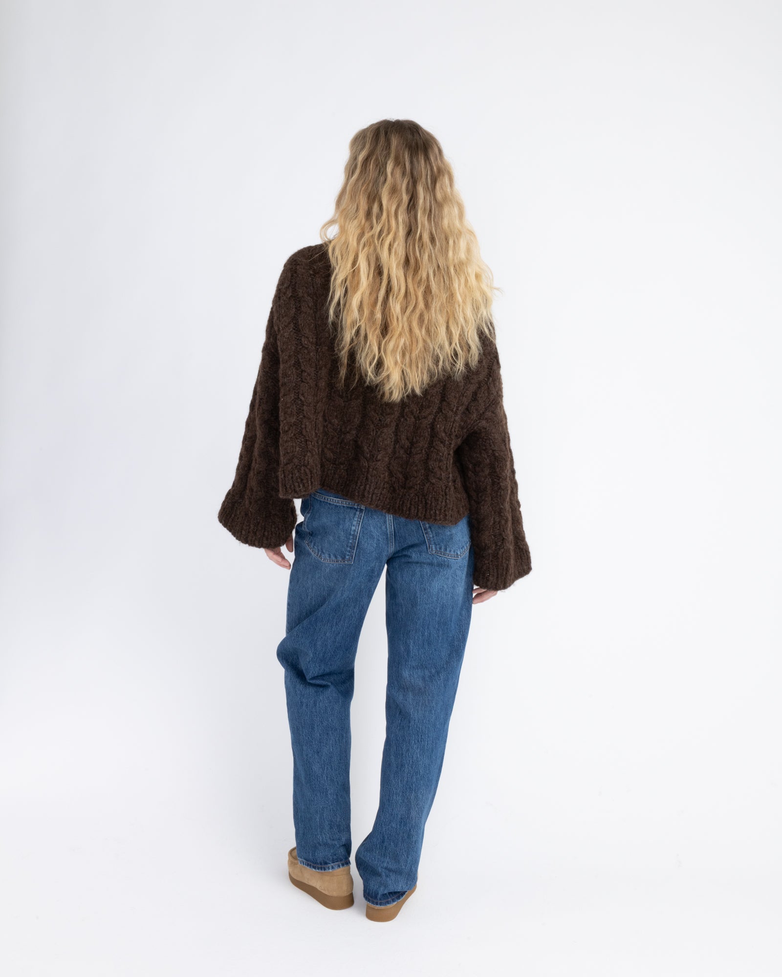 The sweater is knitted in Suri and Myk Norwegian Lambswool in 3010 Mocca and 1011 Mocca.