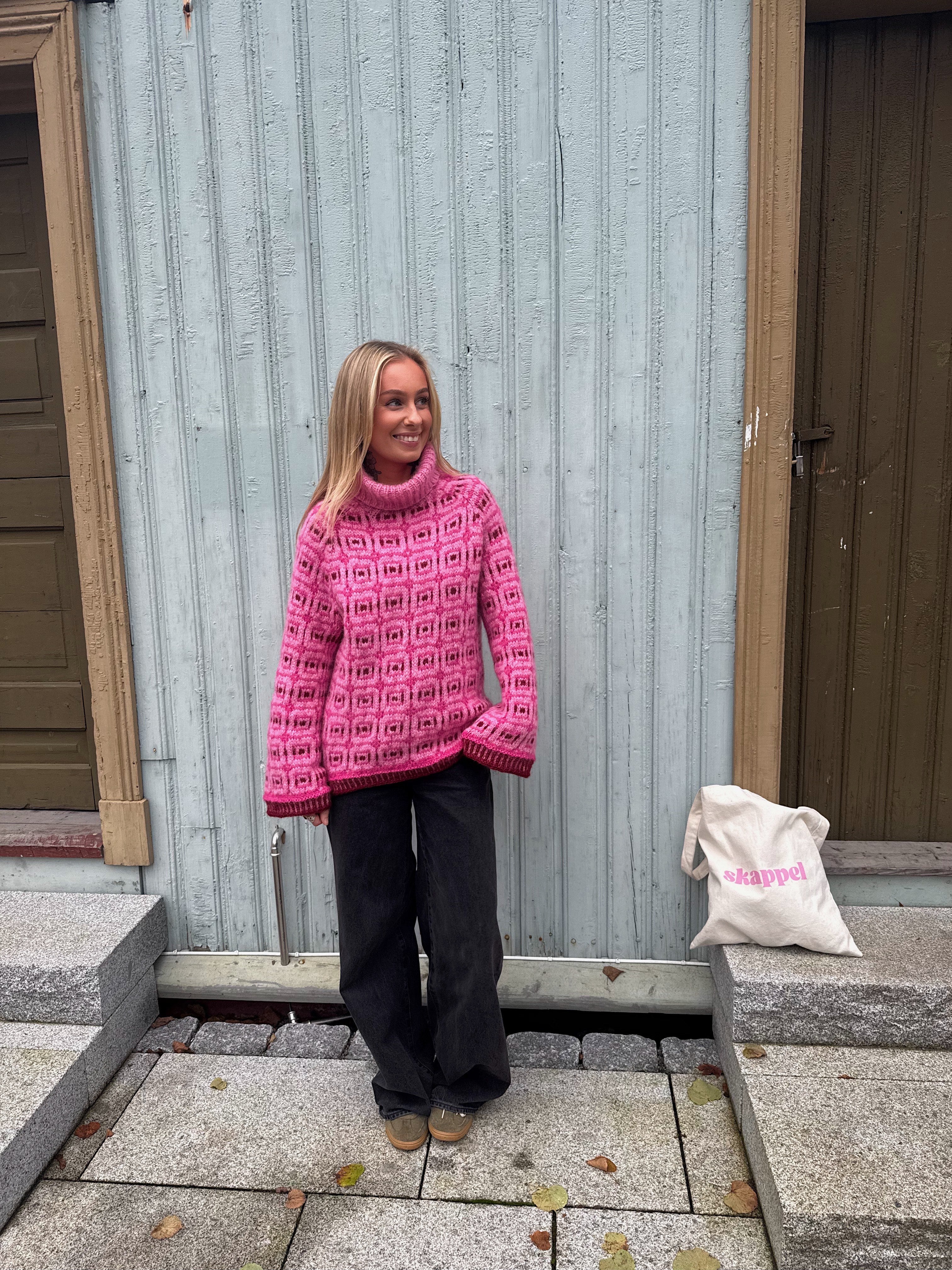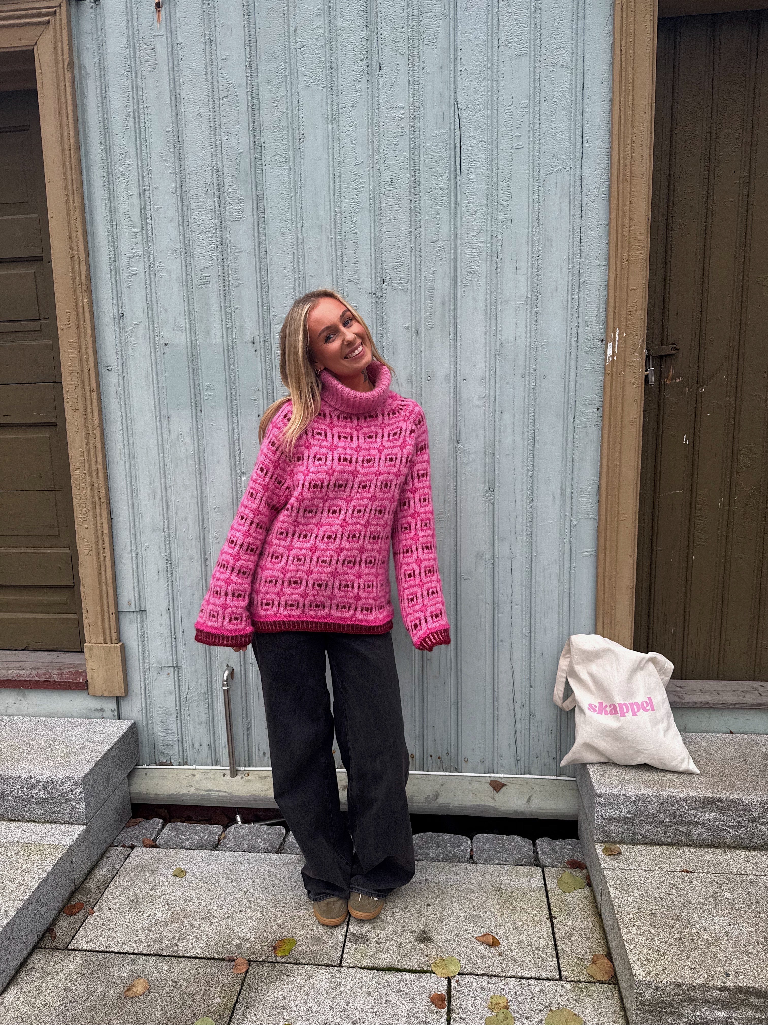 The sweater is knitted in Myk Norwegian Lambswool in 3021 Pink, 3022 Dark Pink and 3027 Cardinal Red.