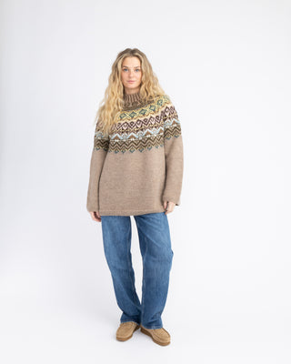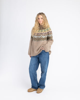 Spire means Sprout, and is a turtleneck sweater with a unique pattern. Knitted in our Spinnvill yarn, made from 100% Norwegian lambswool, it is a soft and lightweight sweater that fits just as well in your wardrobe for winter as for summer.