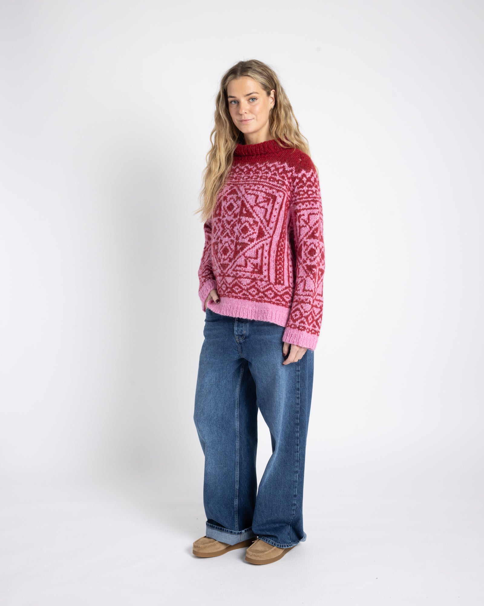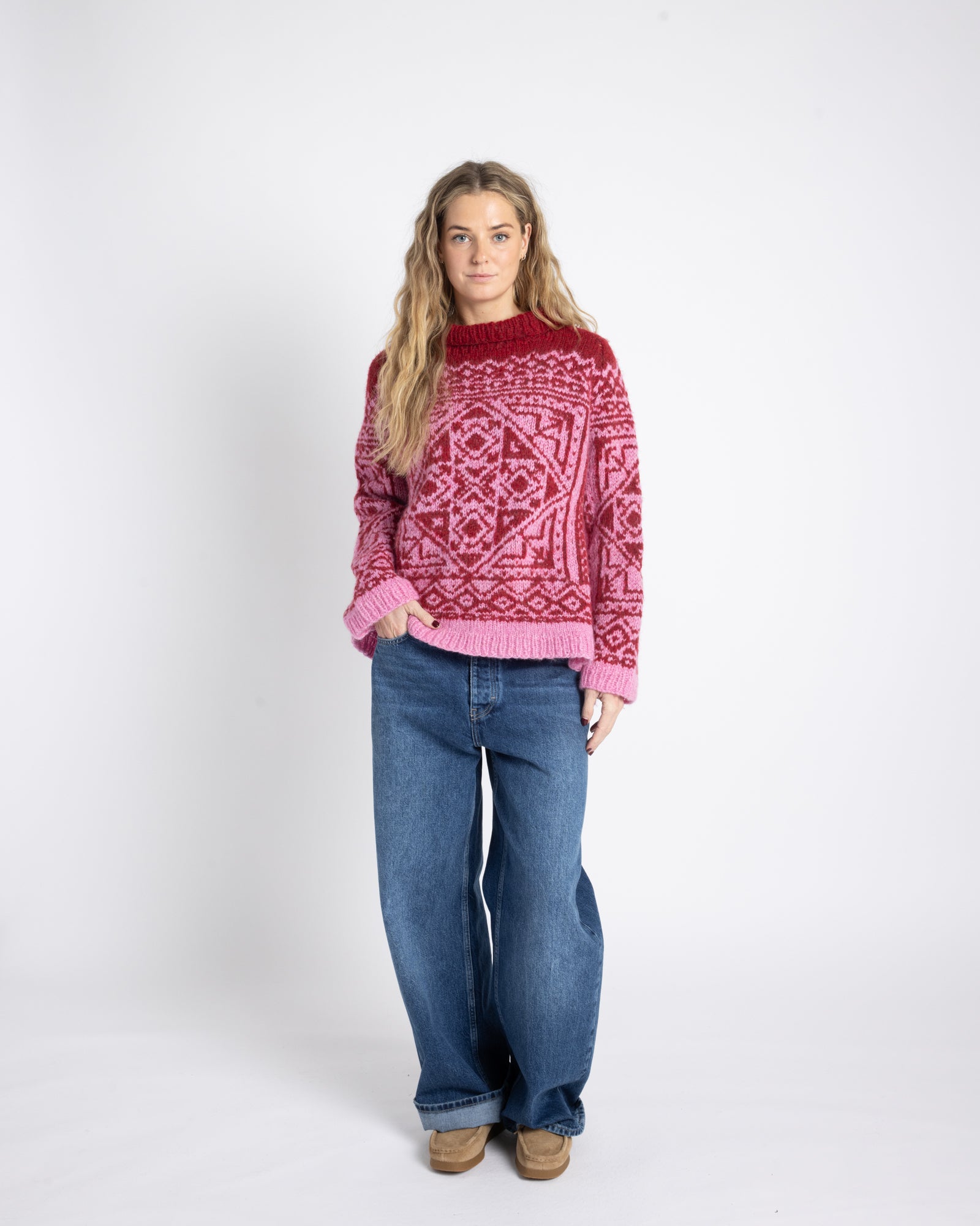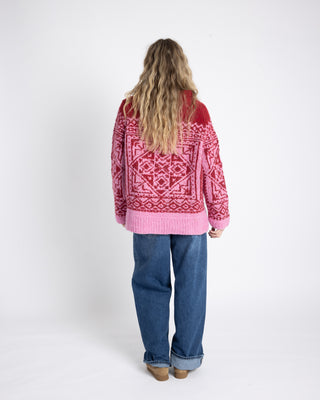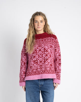 The sweater is knitted in Myk Norwegian Lambswool in 3021 Pink and 3023 Red.