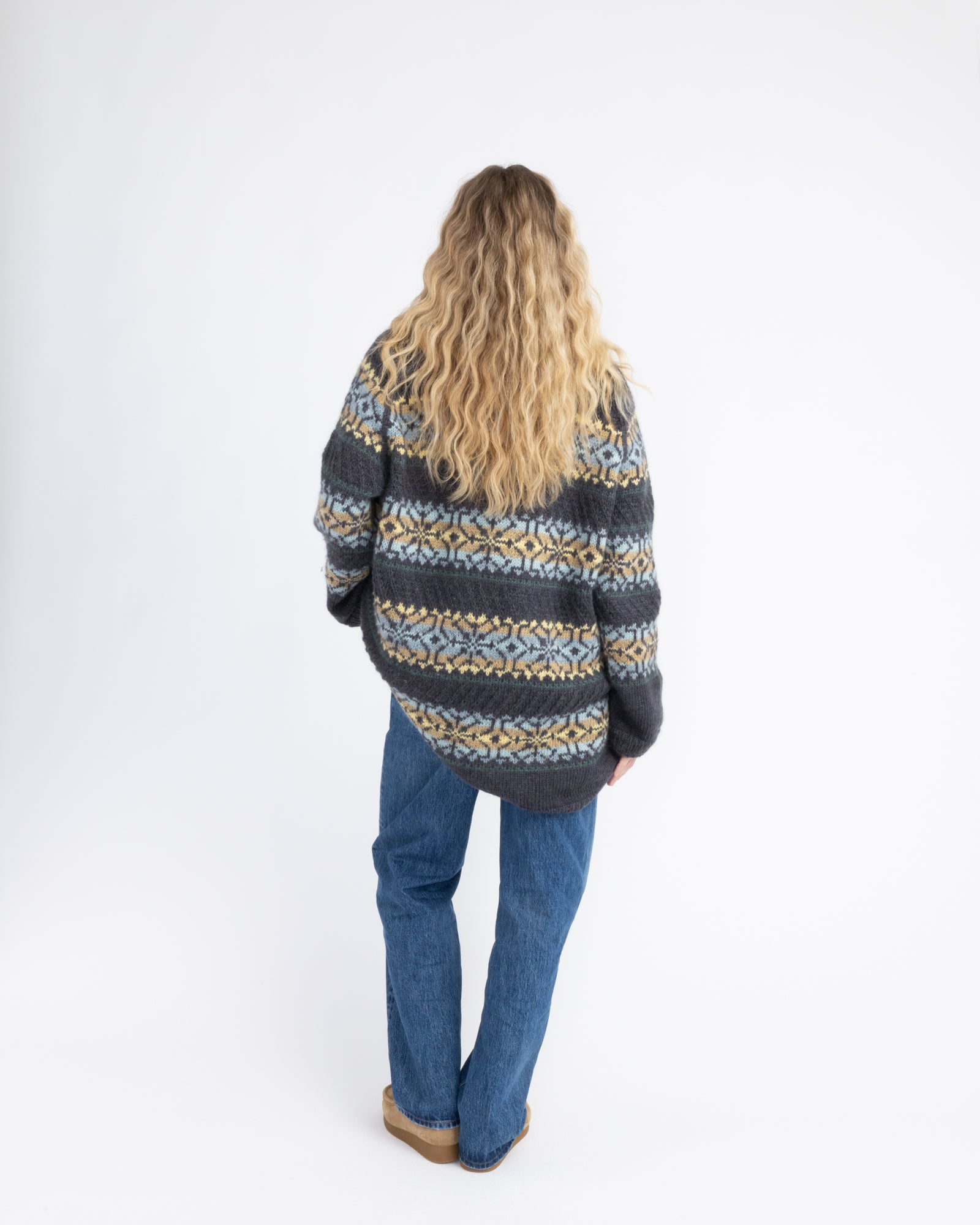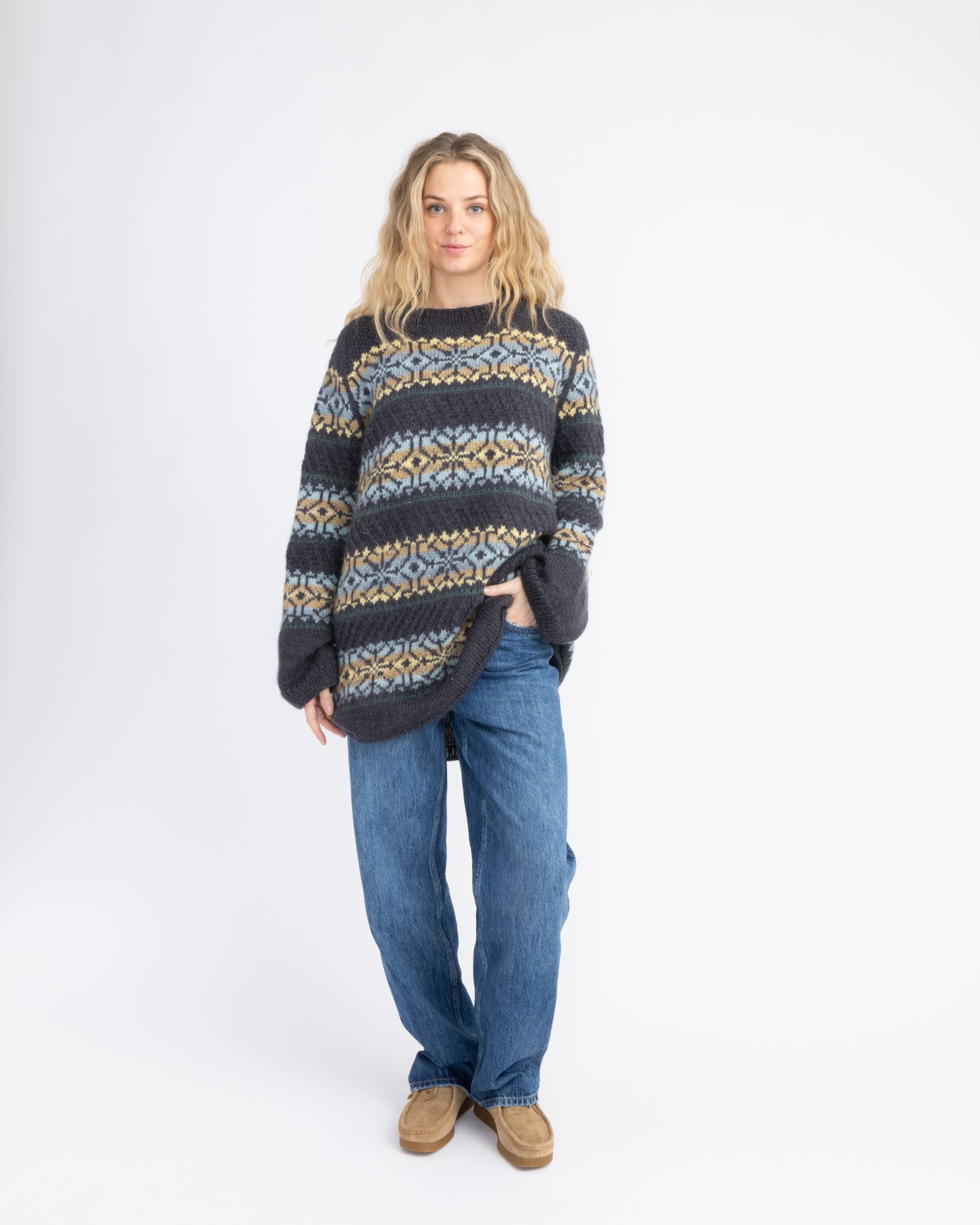 Urt means "herb" and is a long patterned sweater in a beautiful color combination. It features a mix of patterned stockinette stitch and solid-colored textured knitting. This sweater is made with our Spinnvill yarn.