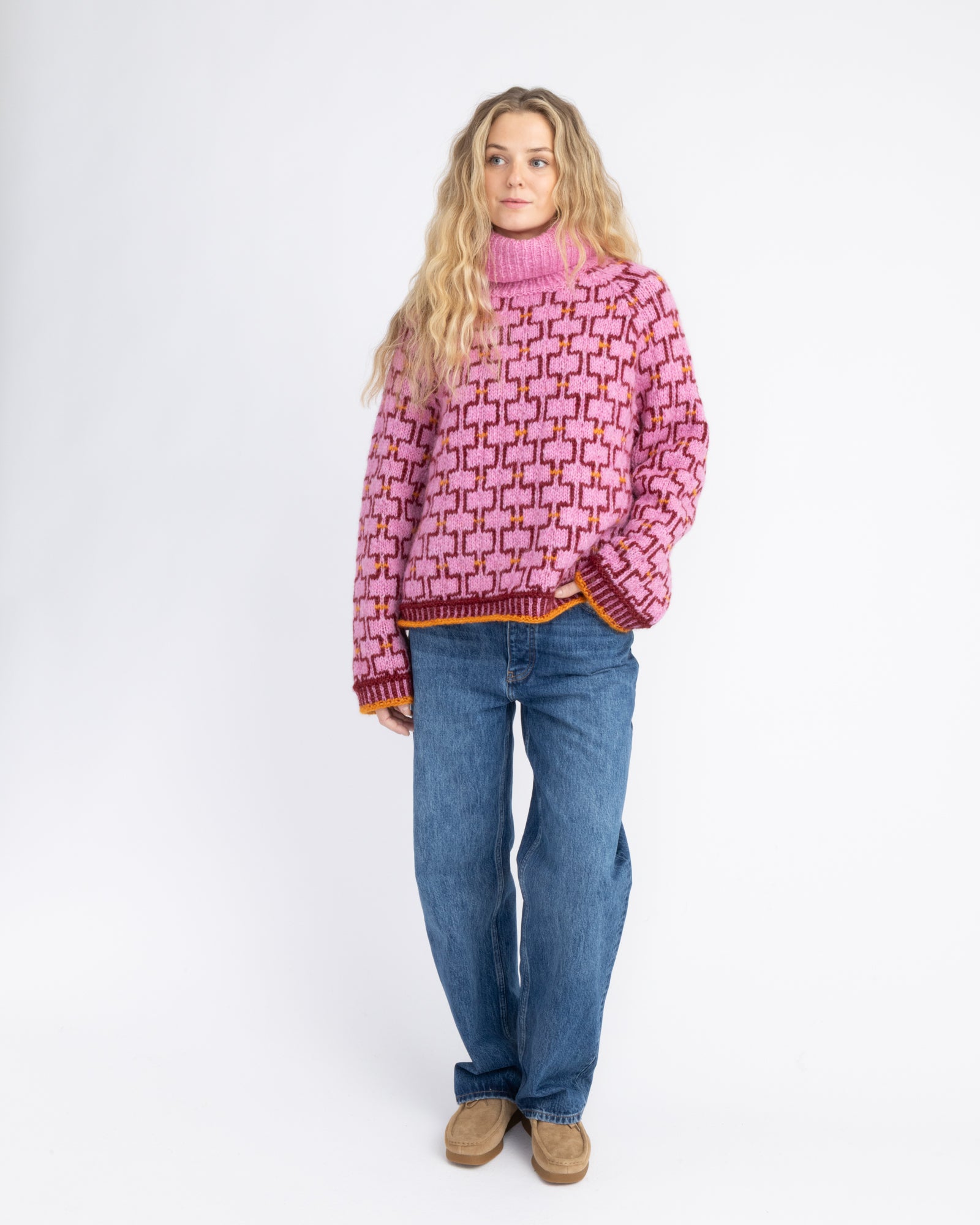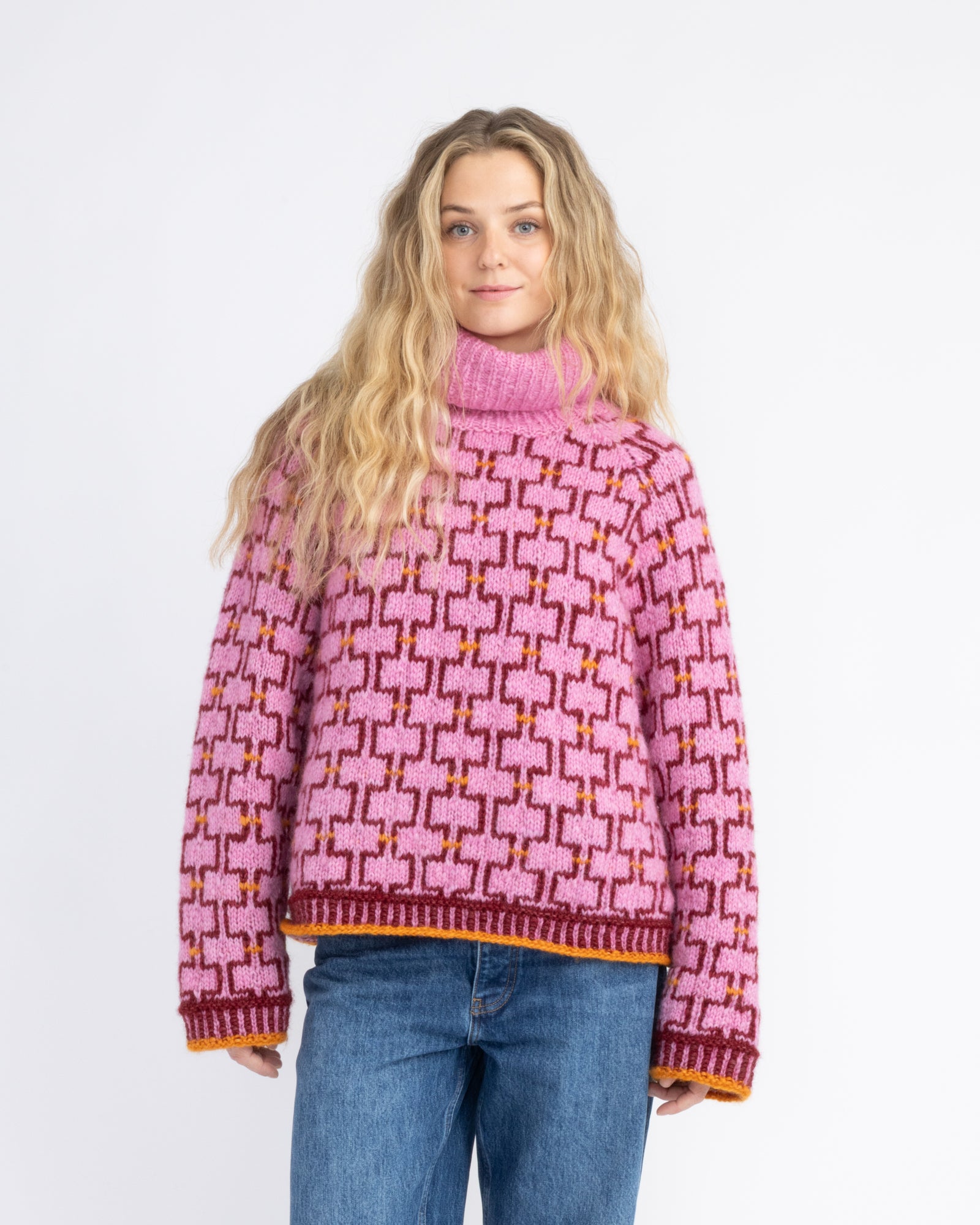 The sweater is knitted in Myk Norwegian Lambswool in 3021 Pink, 3027 Cardinal Red and 3028 Saffron. The sweater is pictured in a size M.