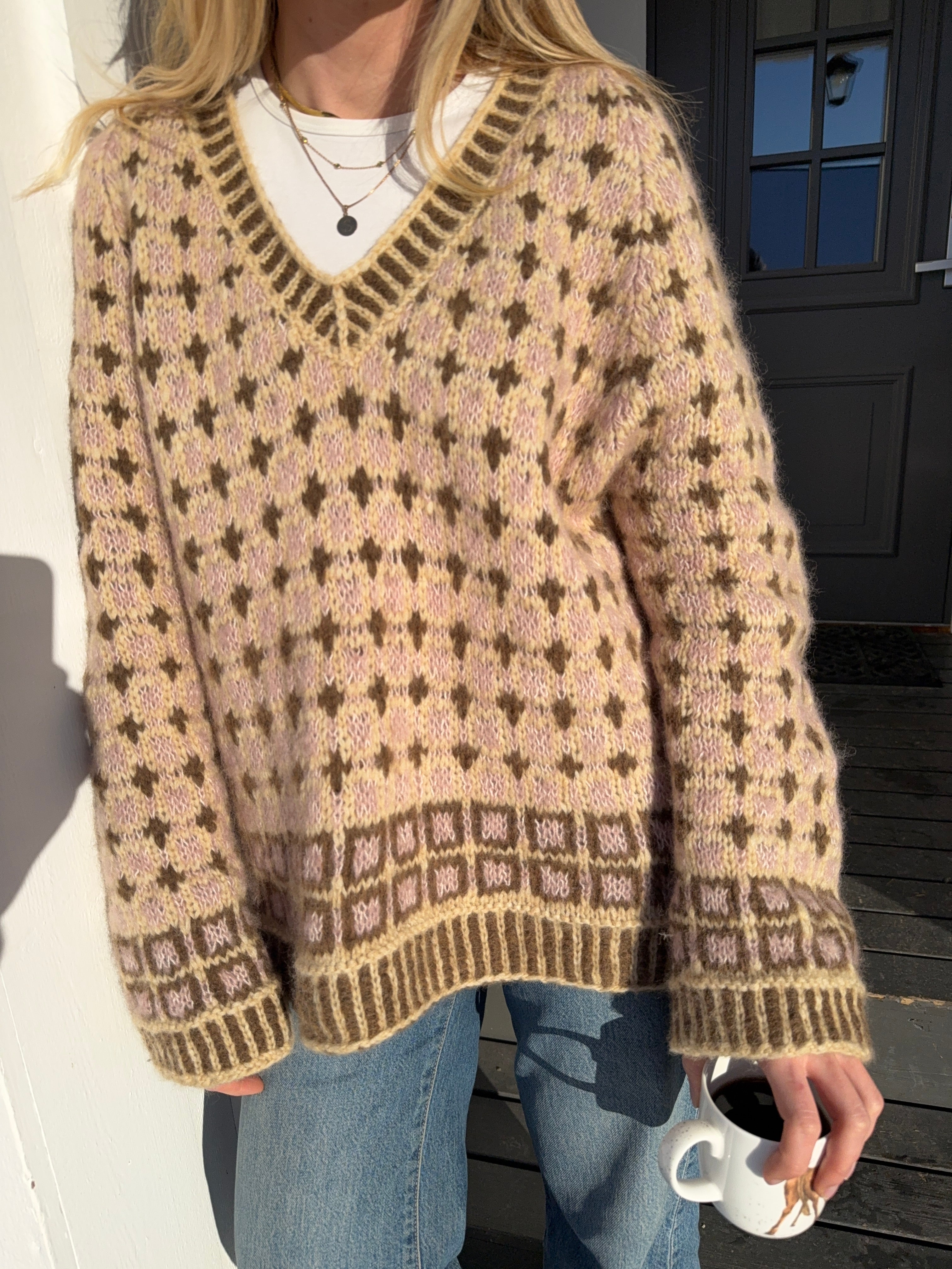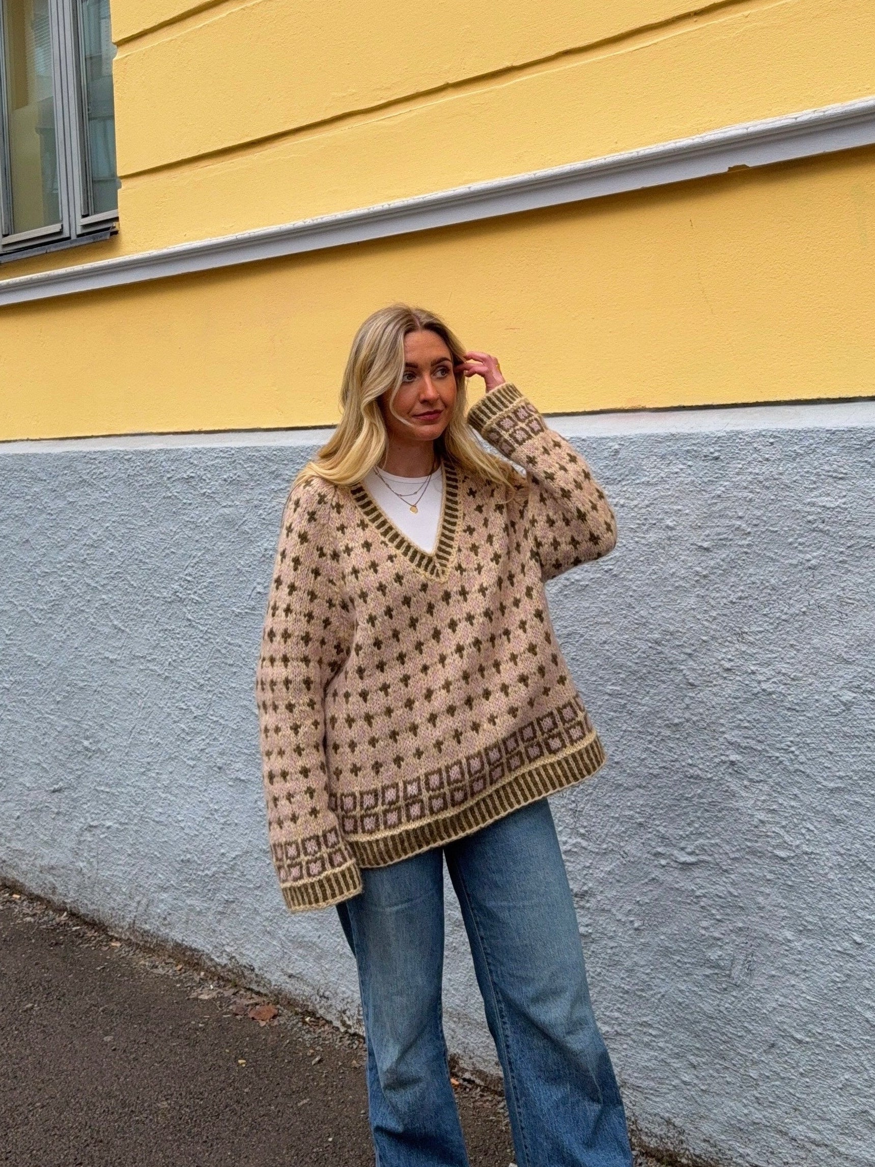 Bris er en en genser med vid og kort passform, v-hals og et unikt mønster. De sterke fargene og det repeterende mønsteret gjør den til den perfekte allsidige statement-genseren.
