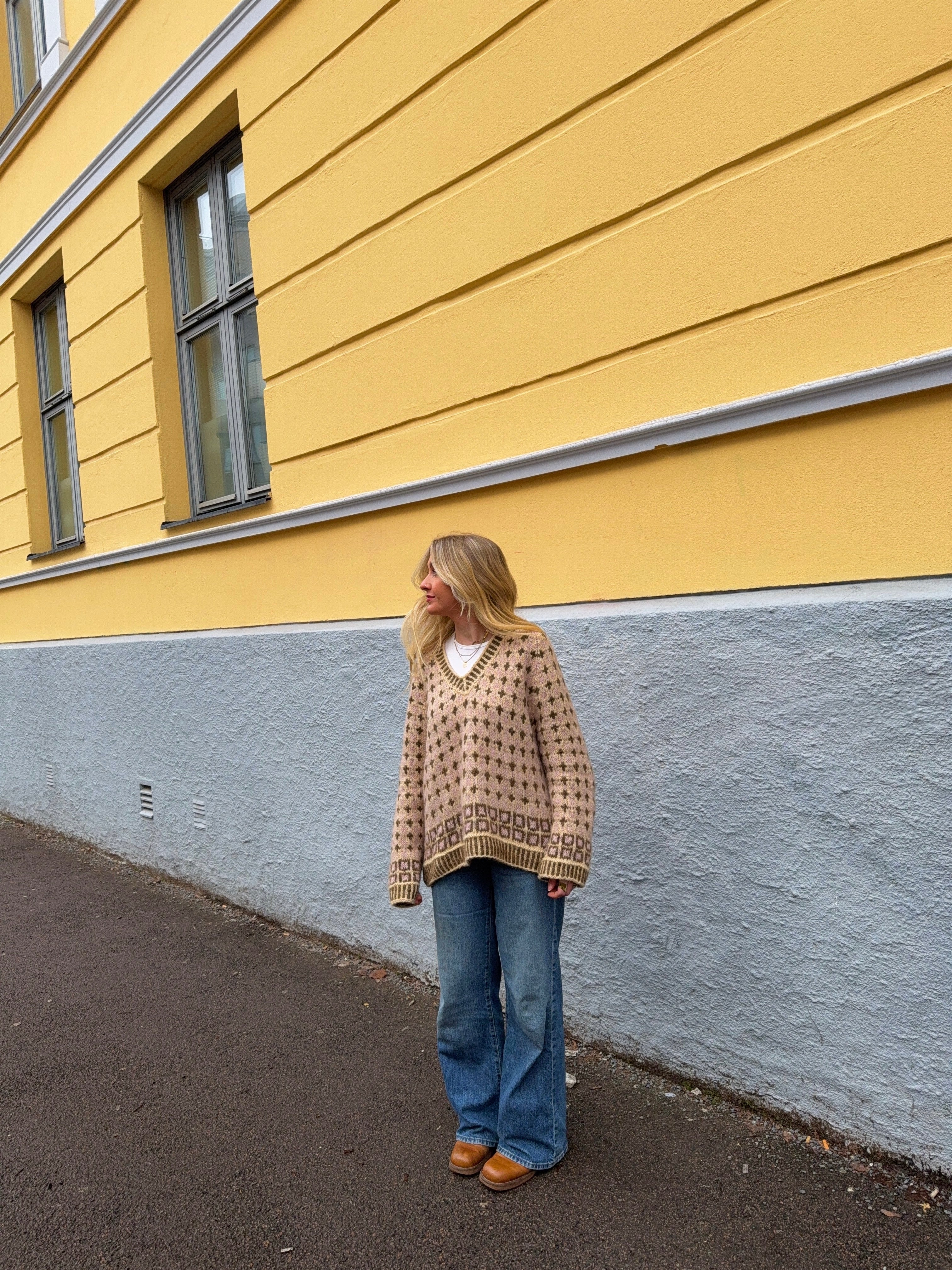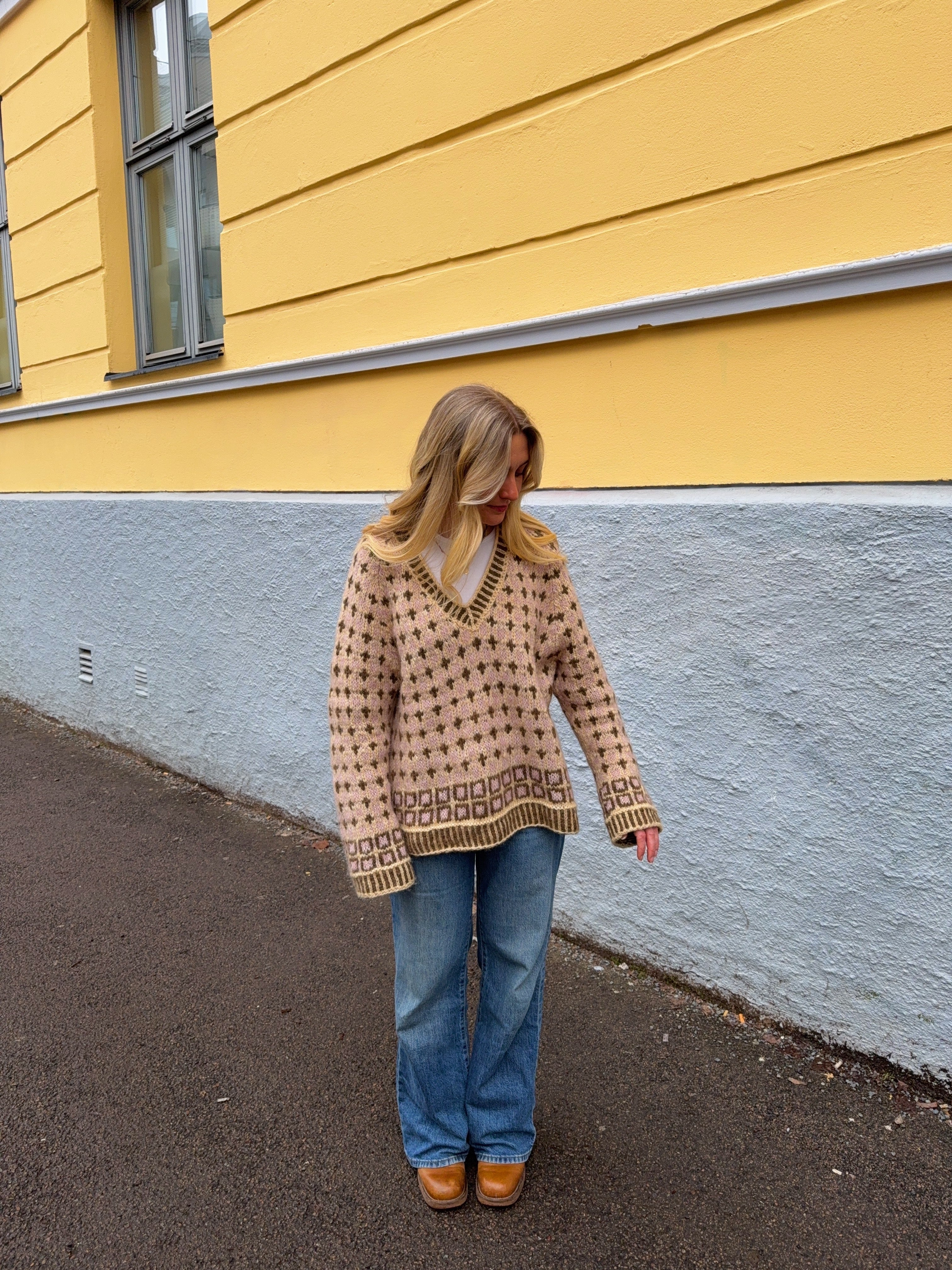 Genseren er strikket i Myk og Suri Norsk Lamull i fargene 3016 Antikkgul, 3015 Ørkenbrun, 1012 Peon.