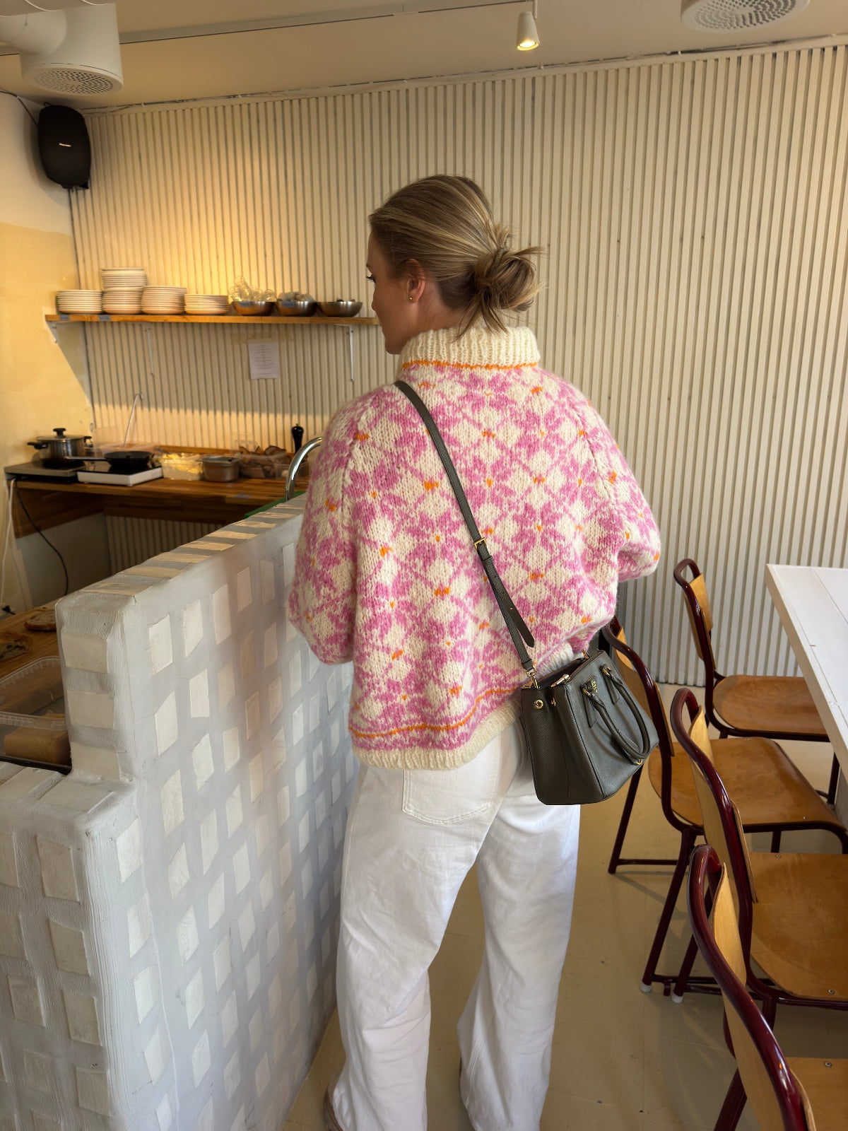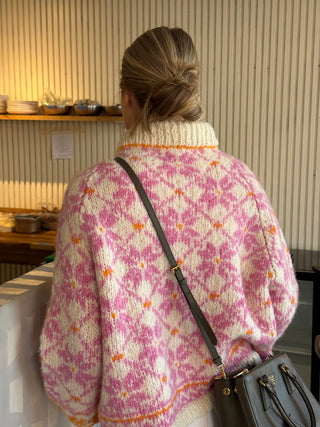 Genseren er strikket i Myk Norsk Lamull i fargene 3001 Naturhvit og 3021 Rosa og 3024 Oransje.