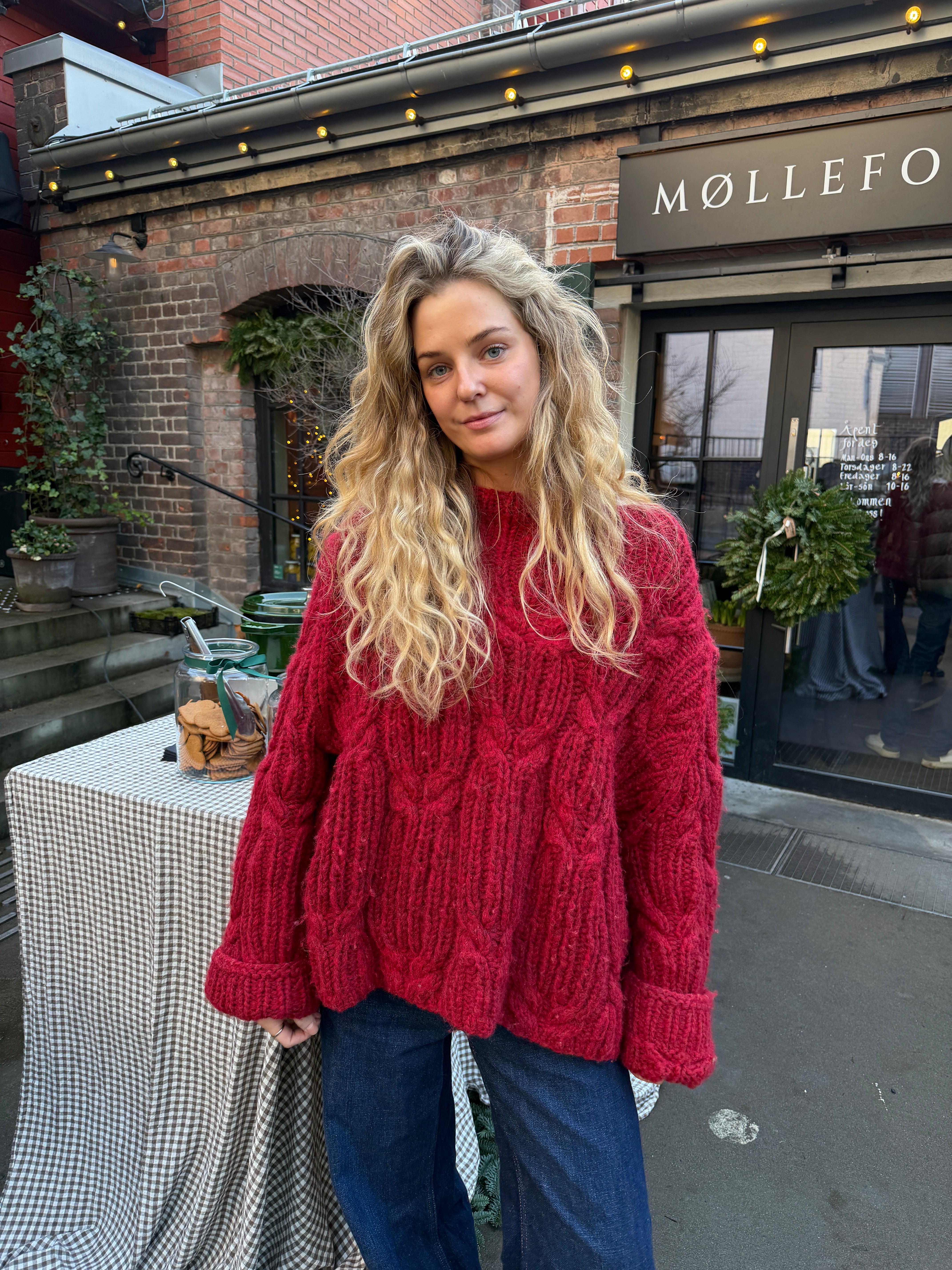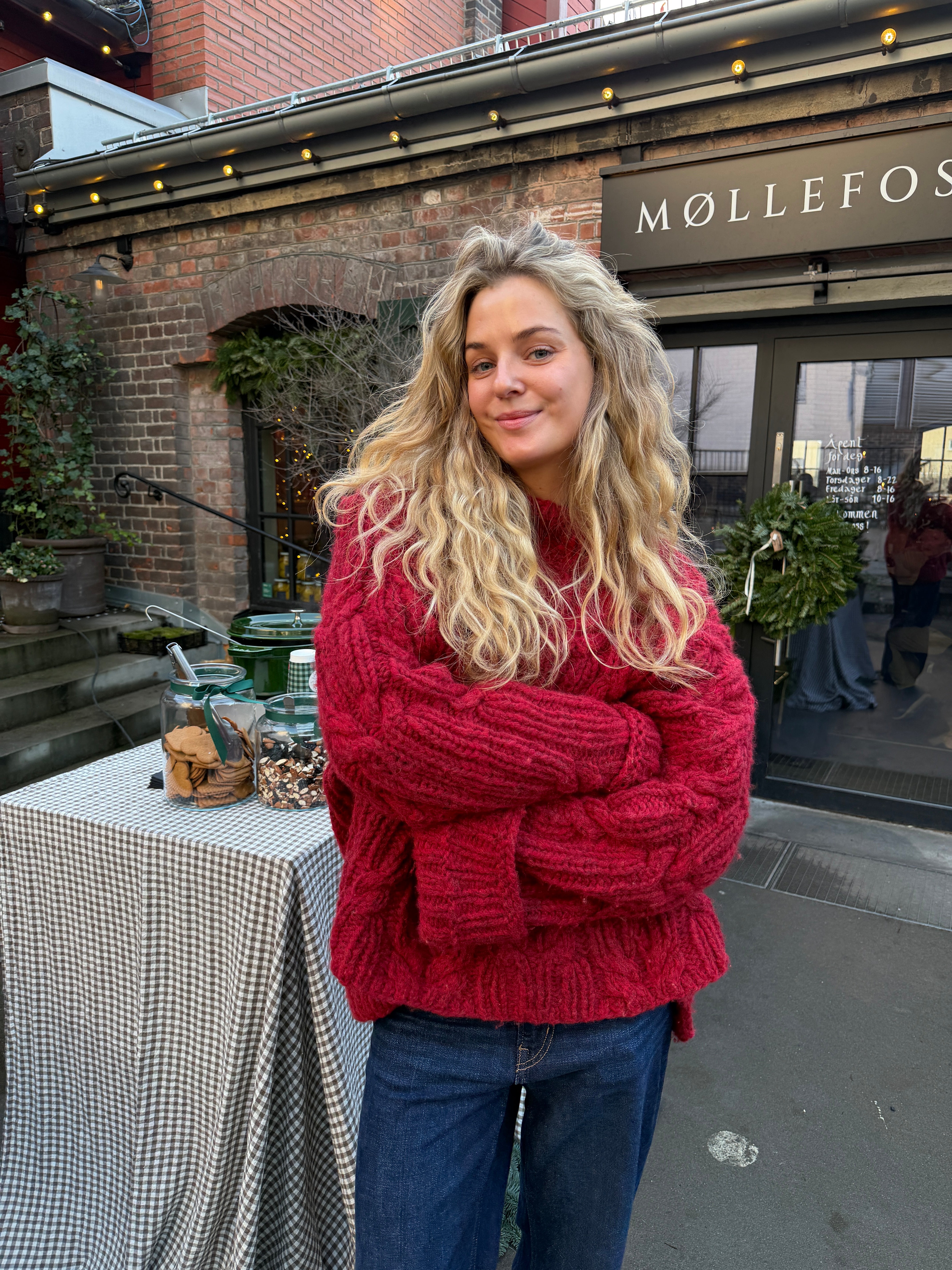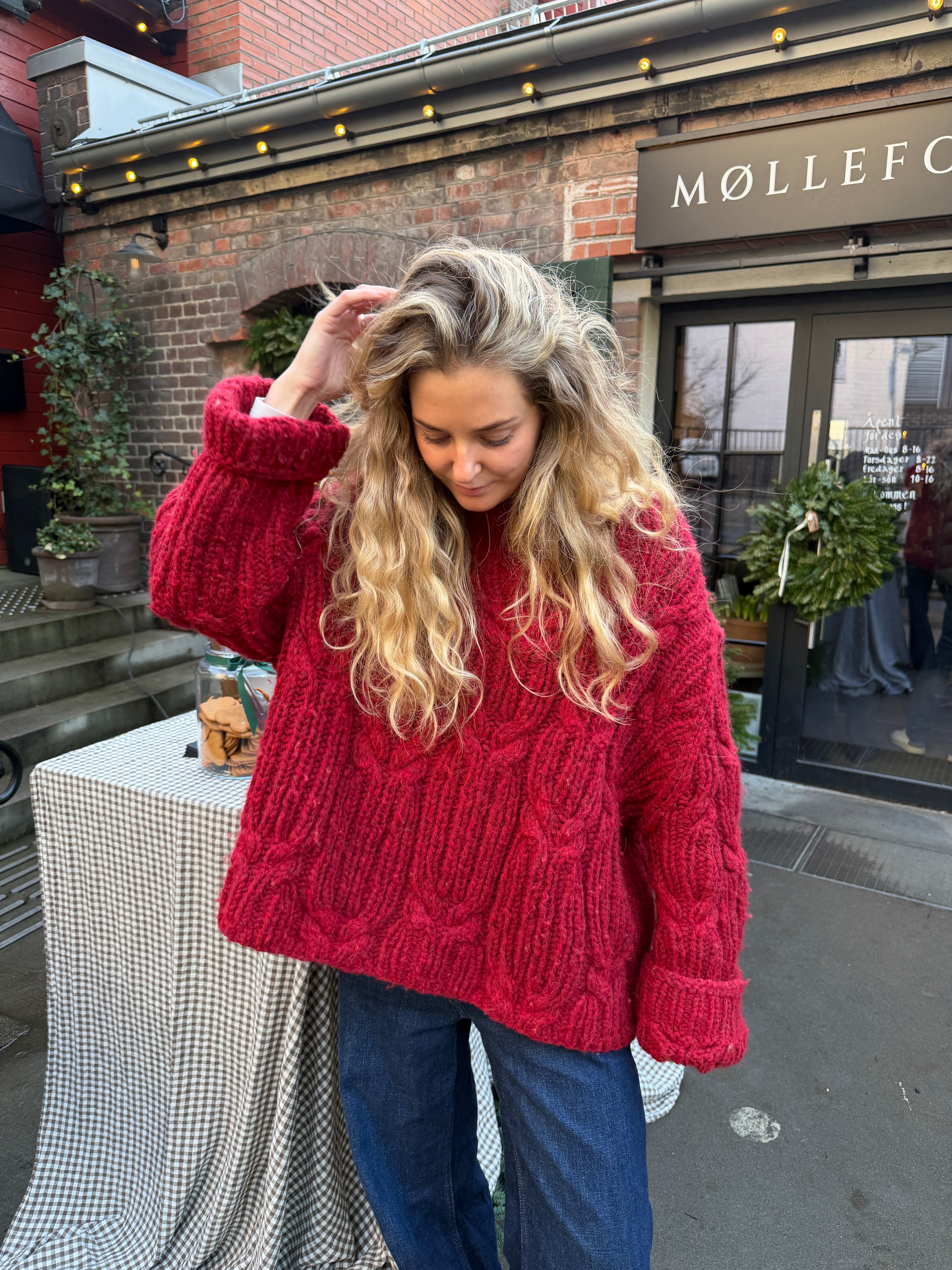 Genseren er strikket i Myk Norsk Lamull i fargen 3023 Rød.
