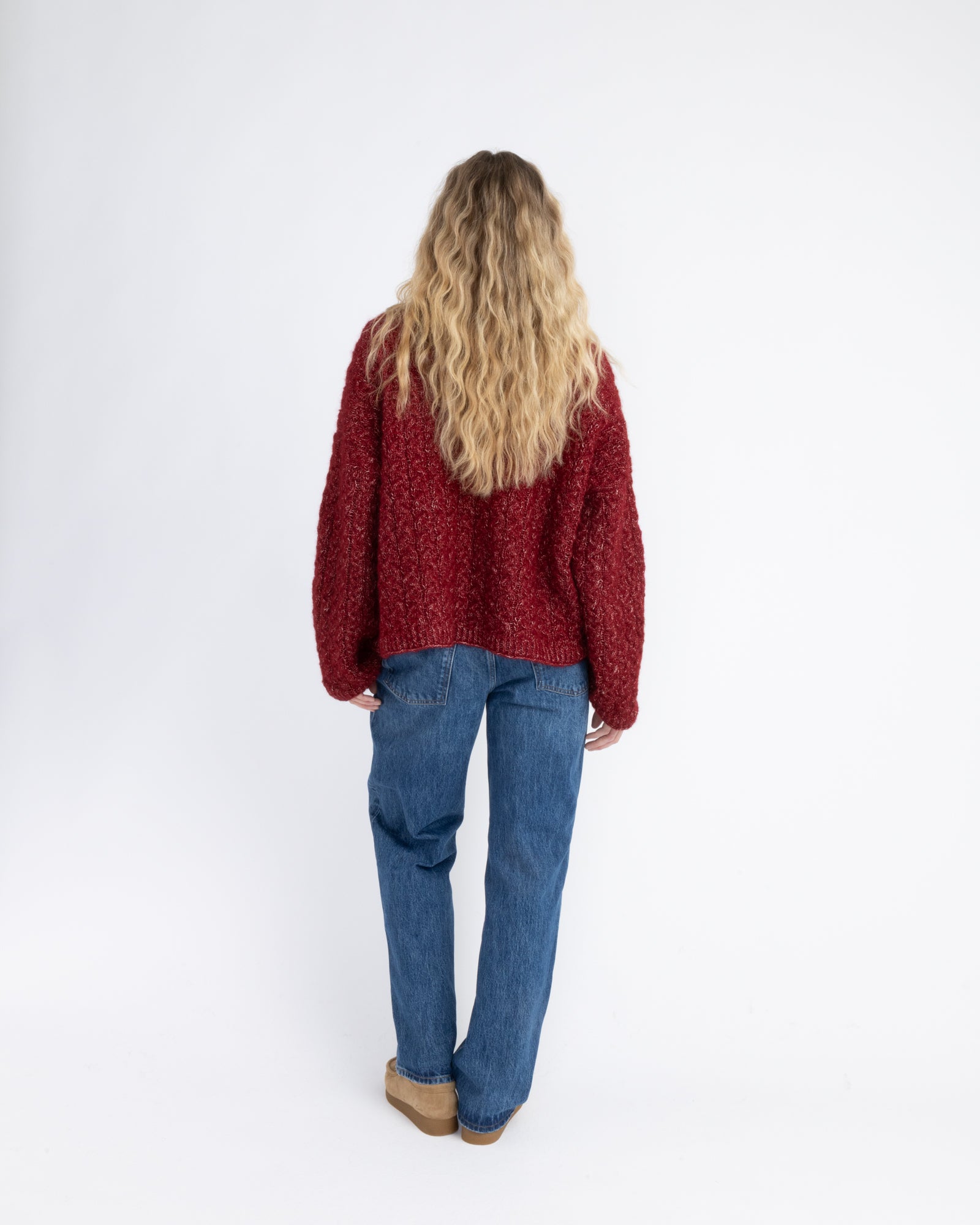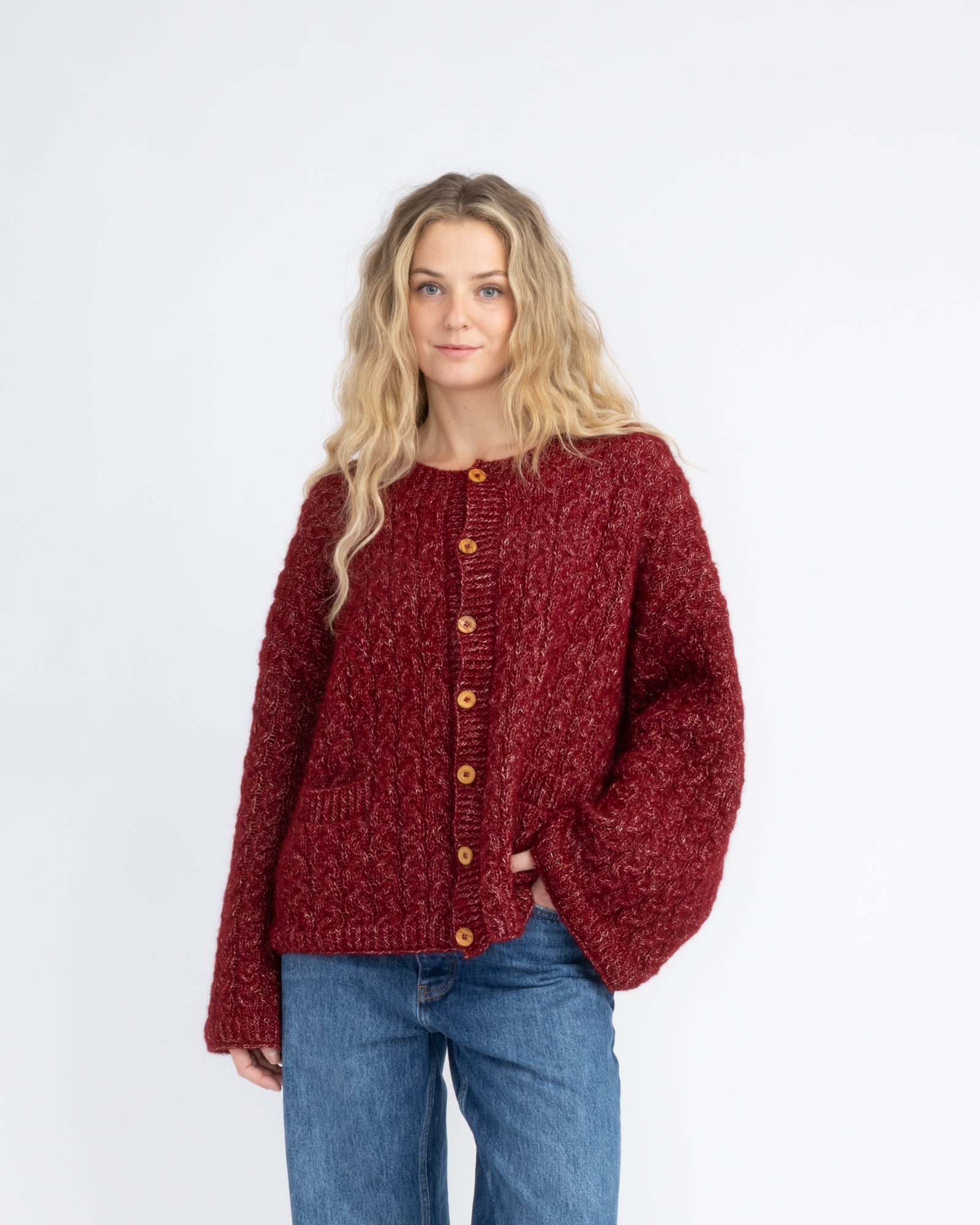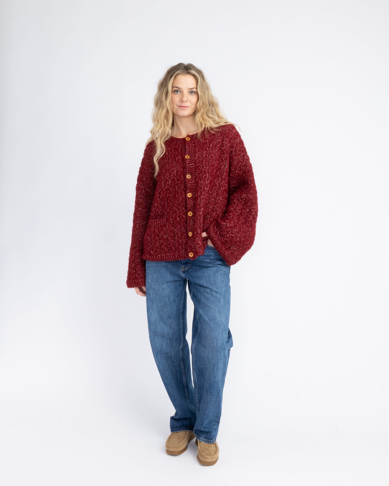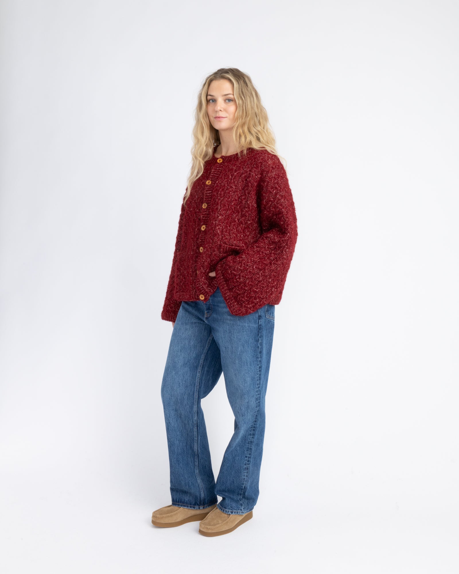 Cardiganen er strikket i Suri Norsk Lamull i fargen 1027 Kardinalrød.
