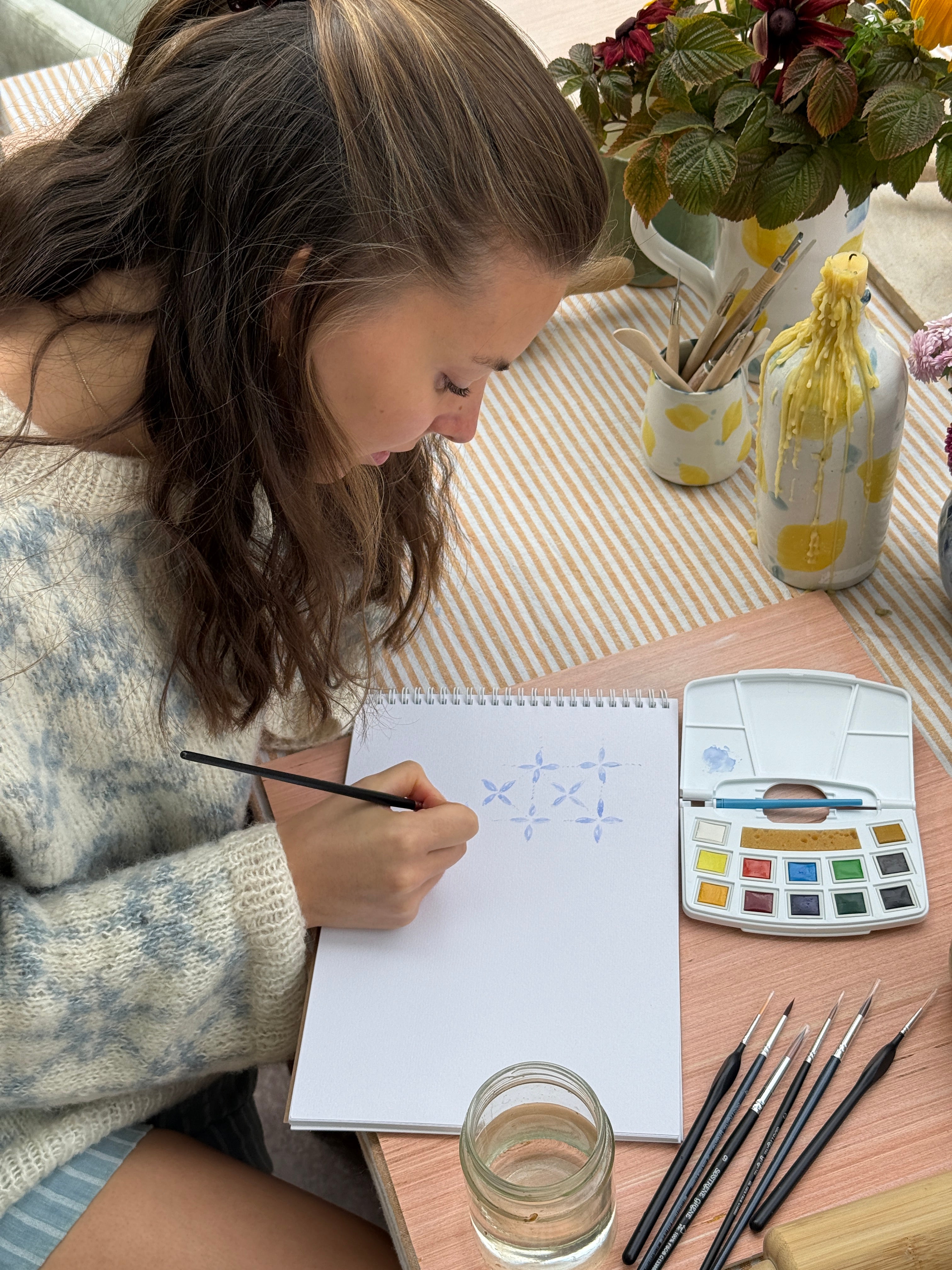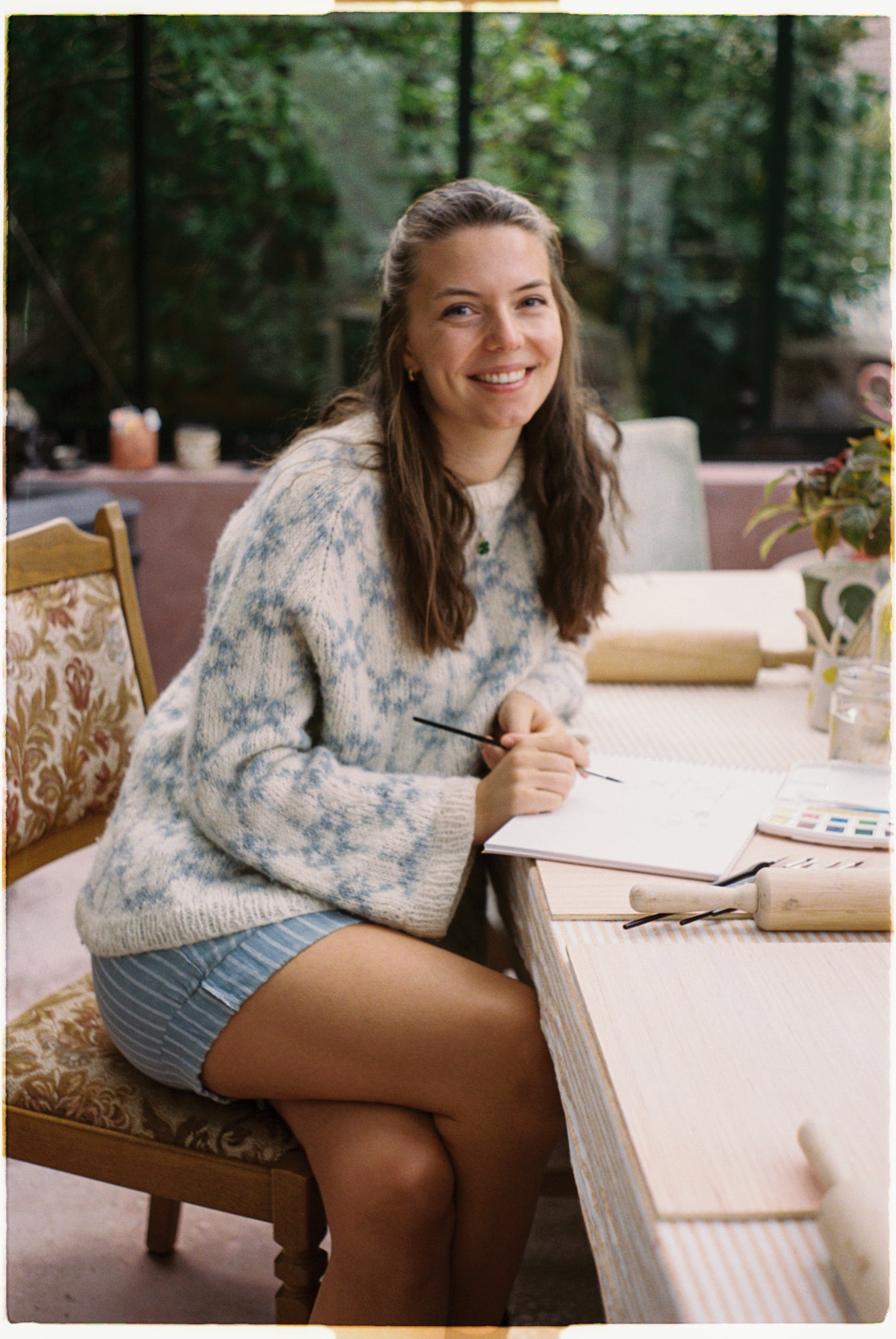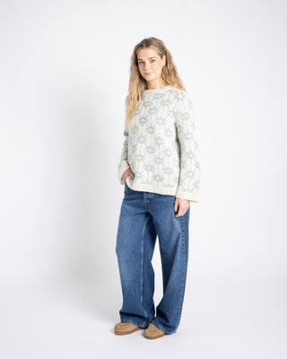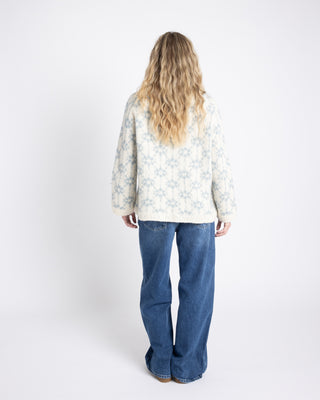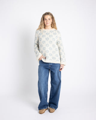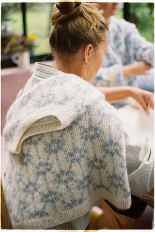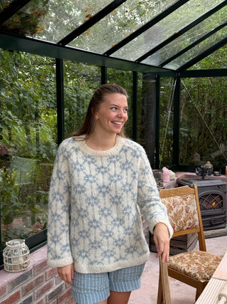 Flora er en luftig mønstret genser. Mønsteret er inspirert av det sarte og vakre i klassisk porselen. Genseren har en oversized passform som gjør den perfekt til kjøligere sommerdager og kvelder som nytes ute.