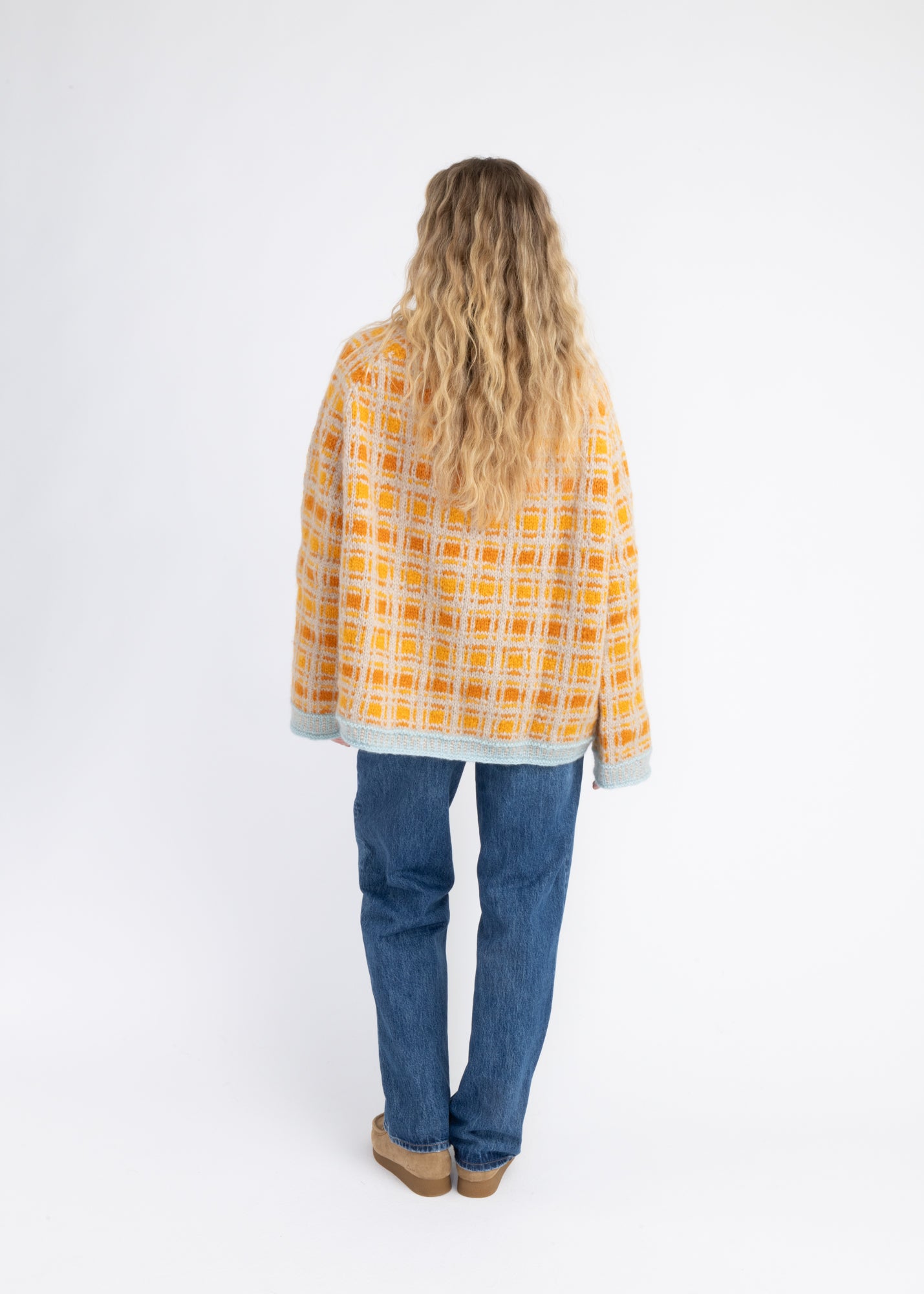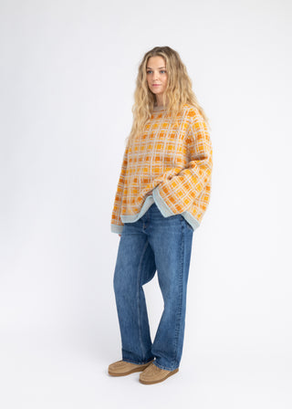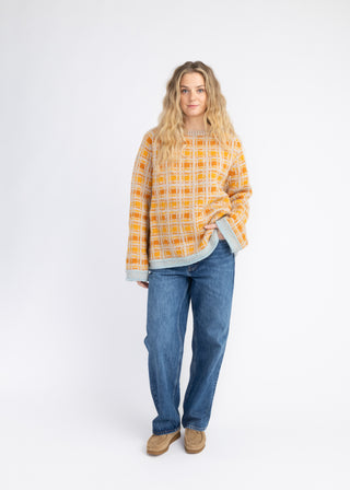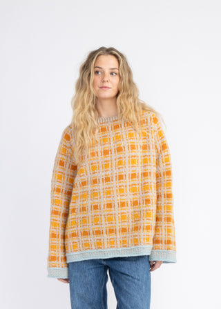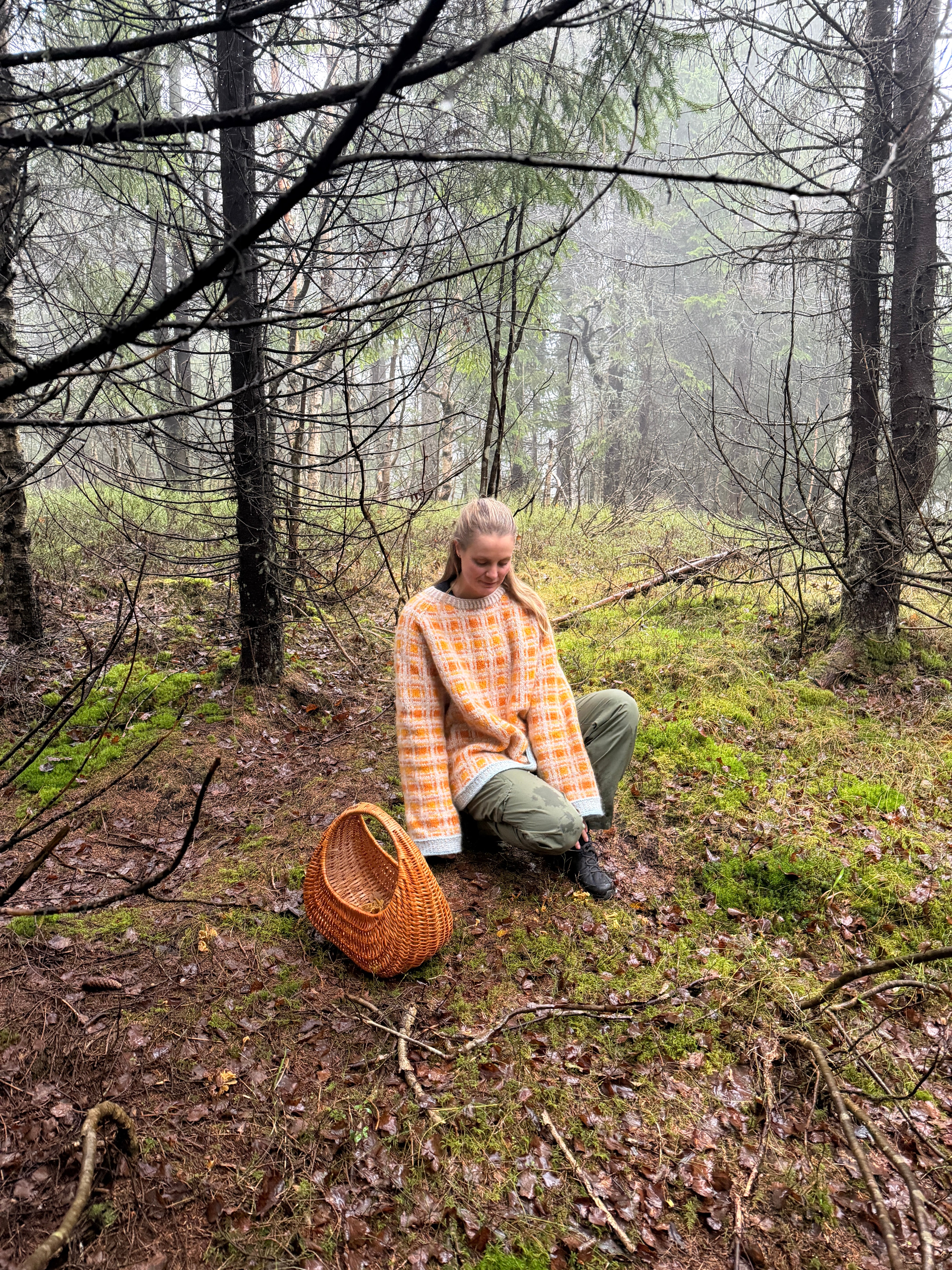 Genseren er strikket i Myk Norsk Lamull i 3033 Sandbeige, 3028 Safranorange, 3029 Okergul og 3007 Mint. Genseren er avbildet i str. M.