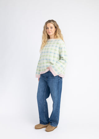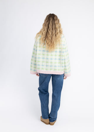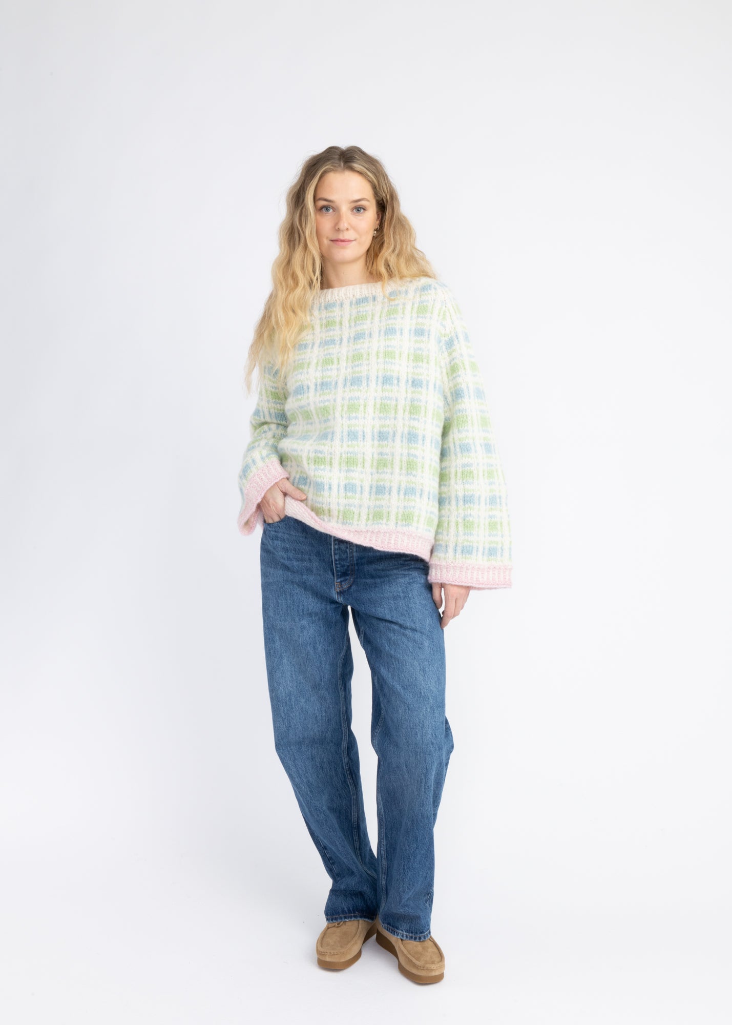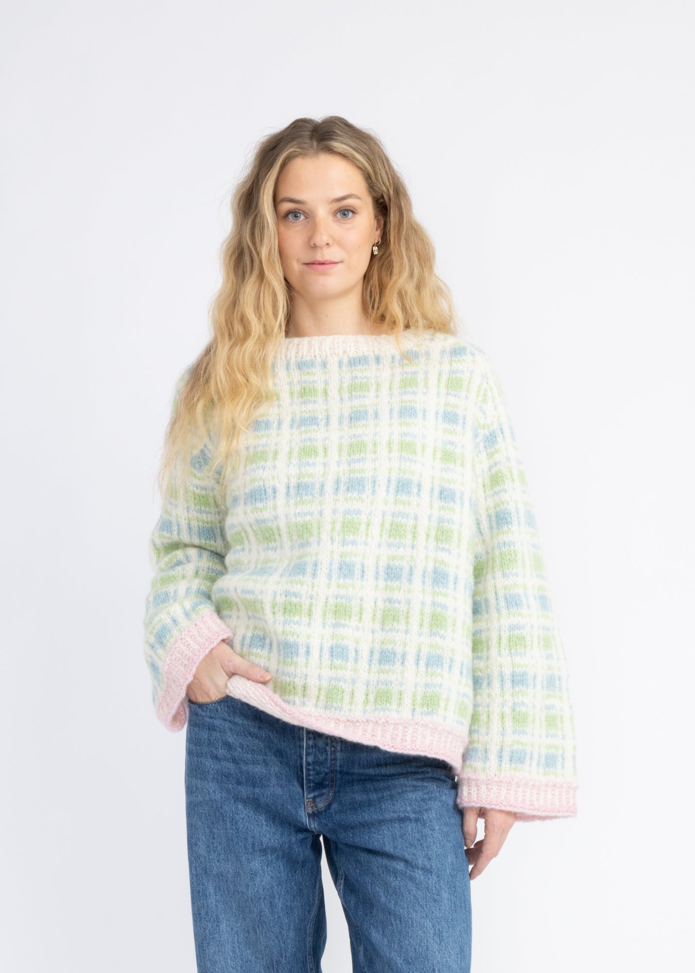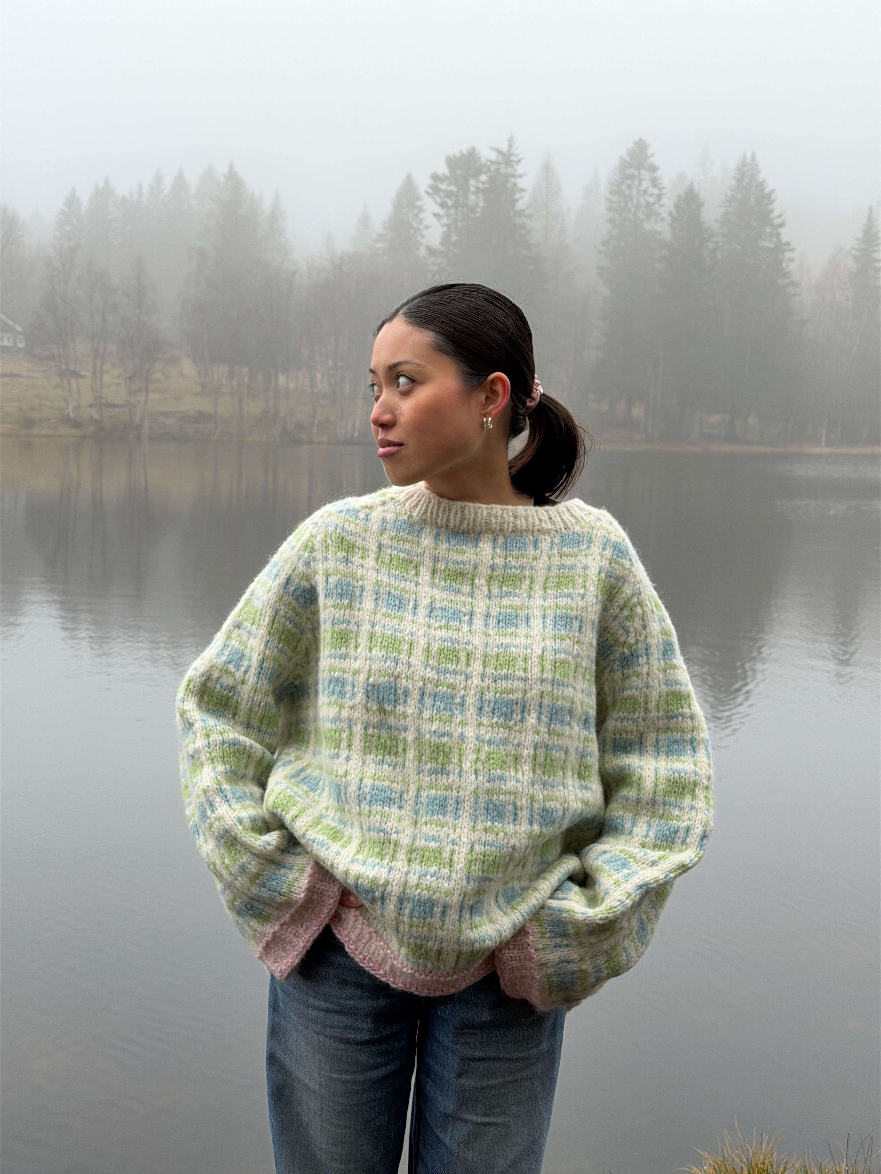 Genseren er strikket i Myk Norsk Lamull i 3001 Naturhvit, 3007 Mint, 3032 Pastellgrønn og 3011 Pudderrosa. Genseren er avbildet i str. S.