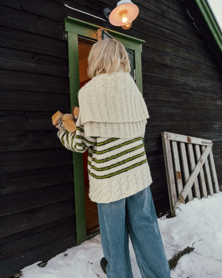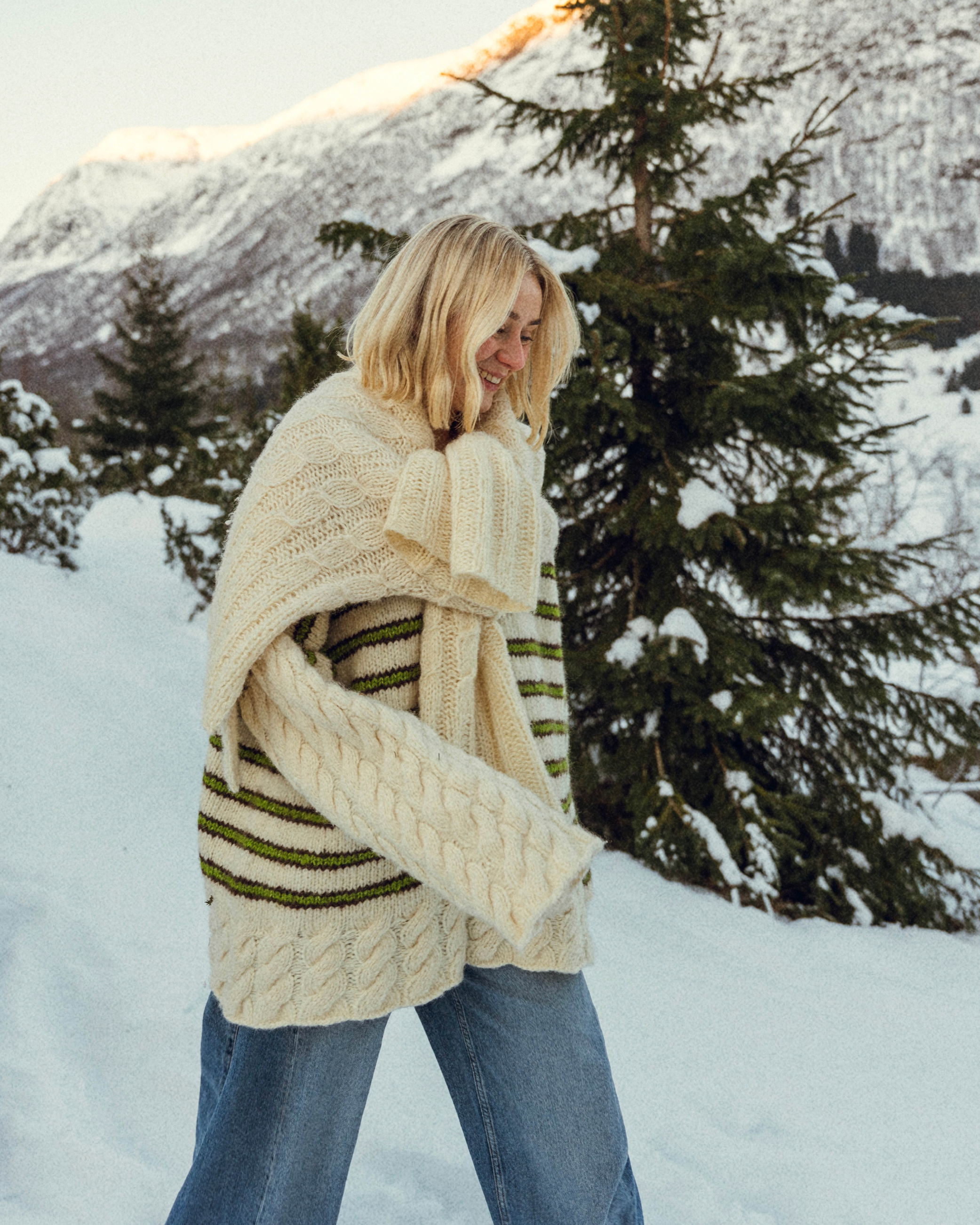 Gunn er en romslig genser med et lekent uttrykk. Den kombinerer fletter i borden, striper, drop-skuldre, ulike ermer (en i fletter og en i striper), og crew-neck. Under finner du