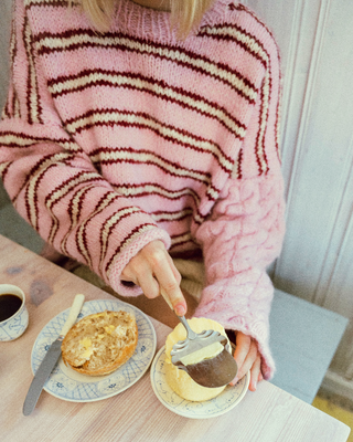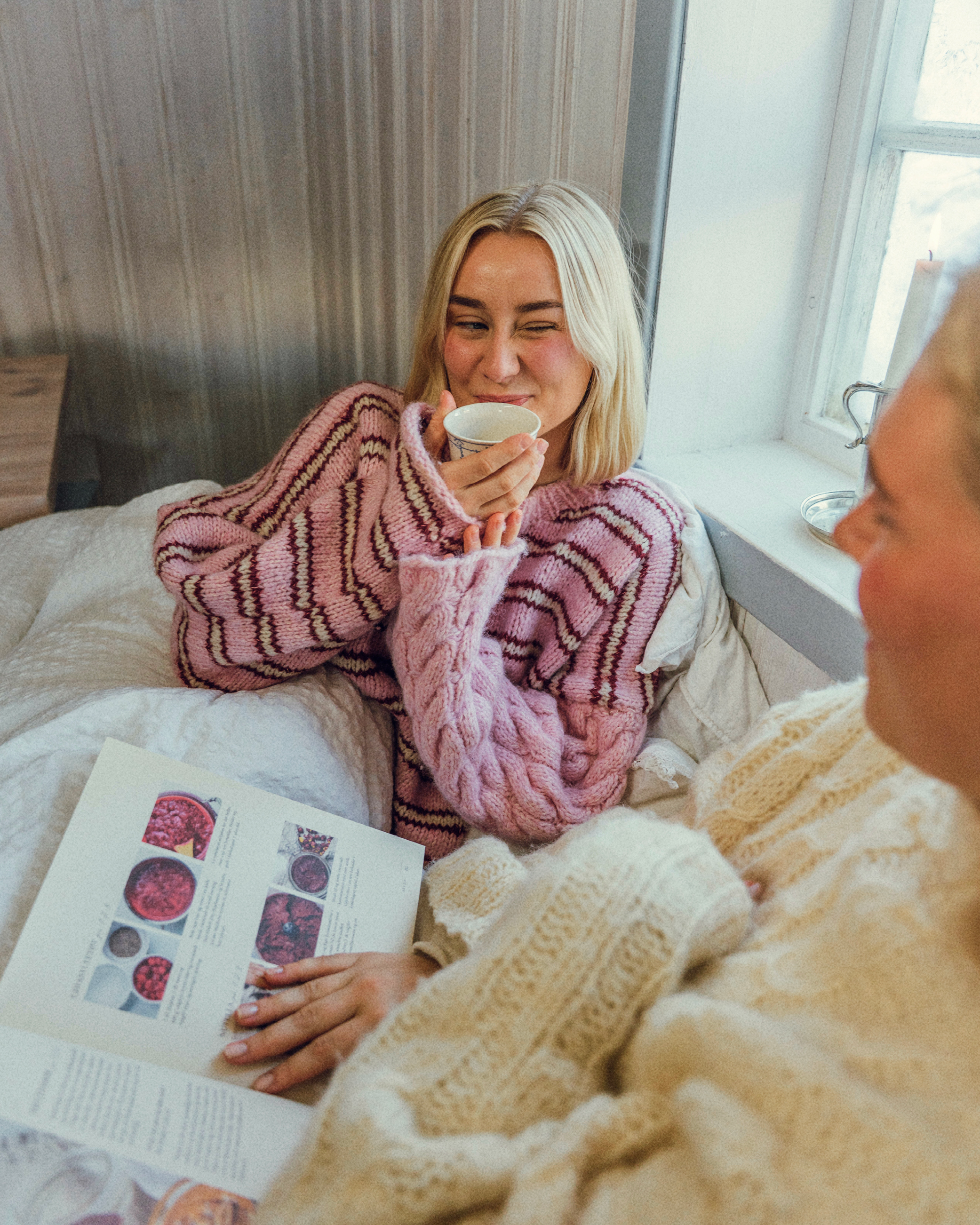 Gunn er en romslig genser med et lekent uttrykk. Den kombinerer fletter i borden, striper, drop-skuldre, ulike ermer (en i fletter og en i striper), og crew-neck. Under finner du