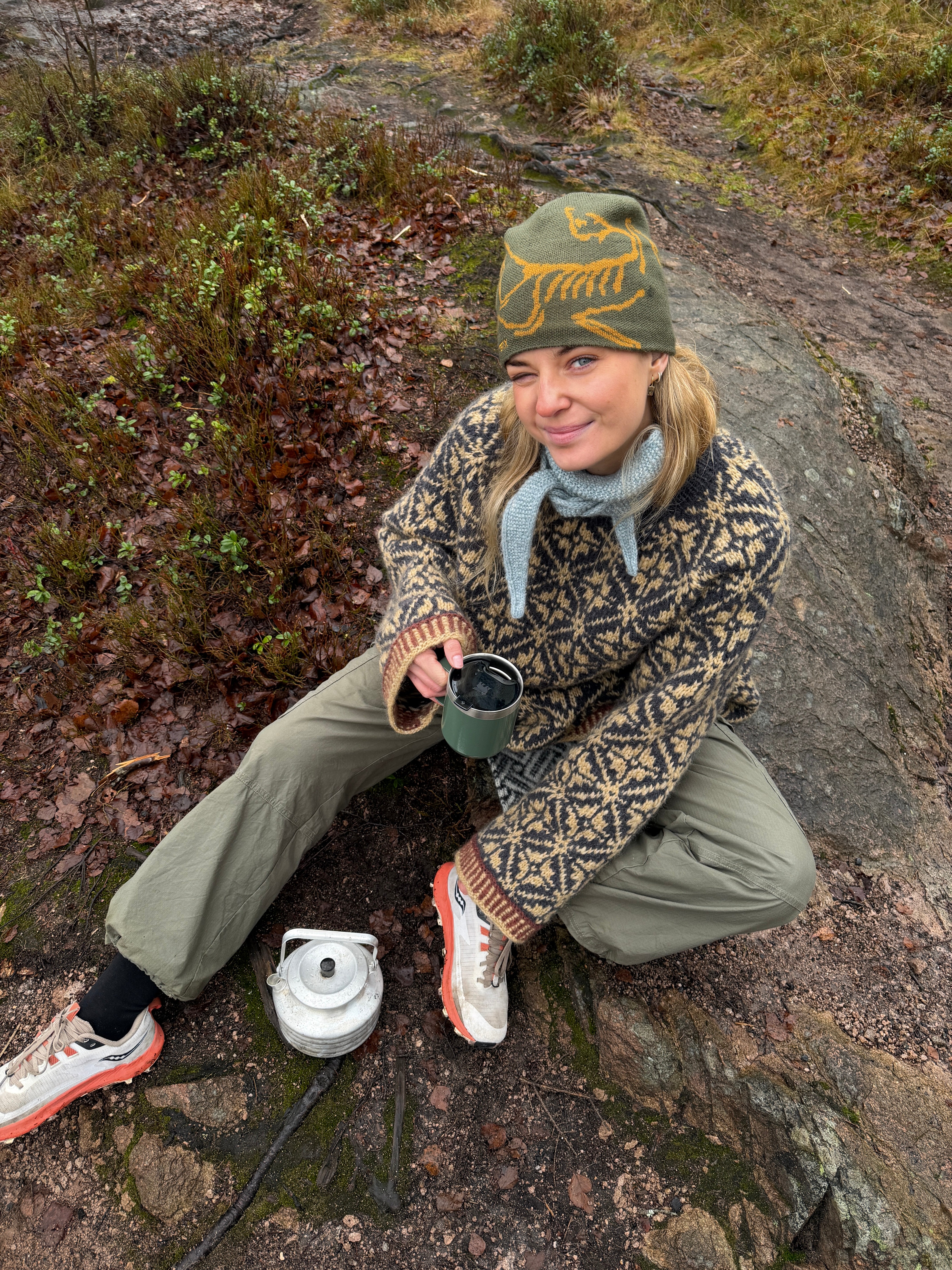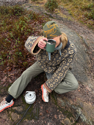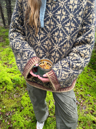 Kantarell er en strikket genser med en bred passform. Genseren er den perfekte tykke strikkegenseren for kaldere dager, siden den er slitesterk og varm for utendørsbruk og komfortabel og lun for innendørsbruk.