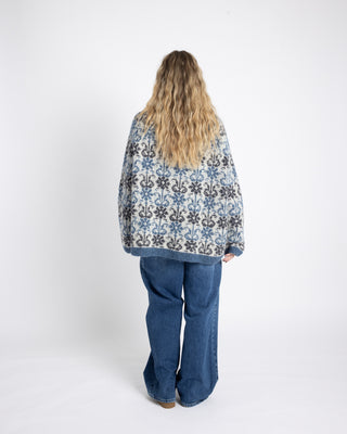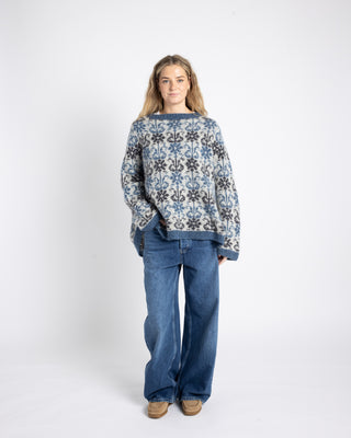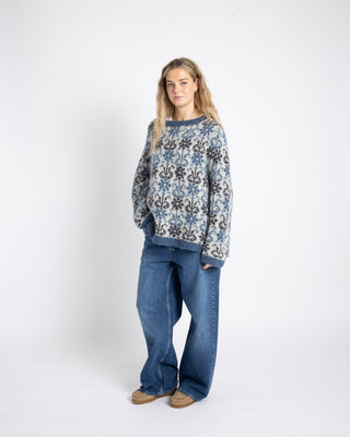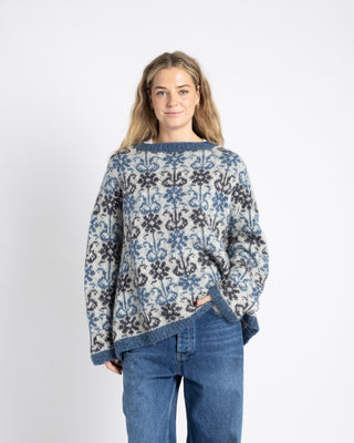 Genseren er strikket i Suri Norsk Lamull i fargene 1003 Gråmelert, 1004 Mørk Gråblå og 1005 Kveldsblå.