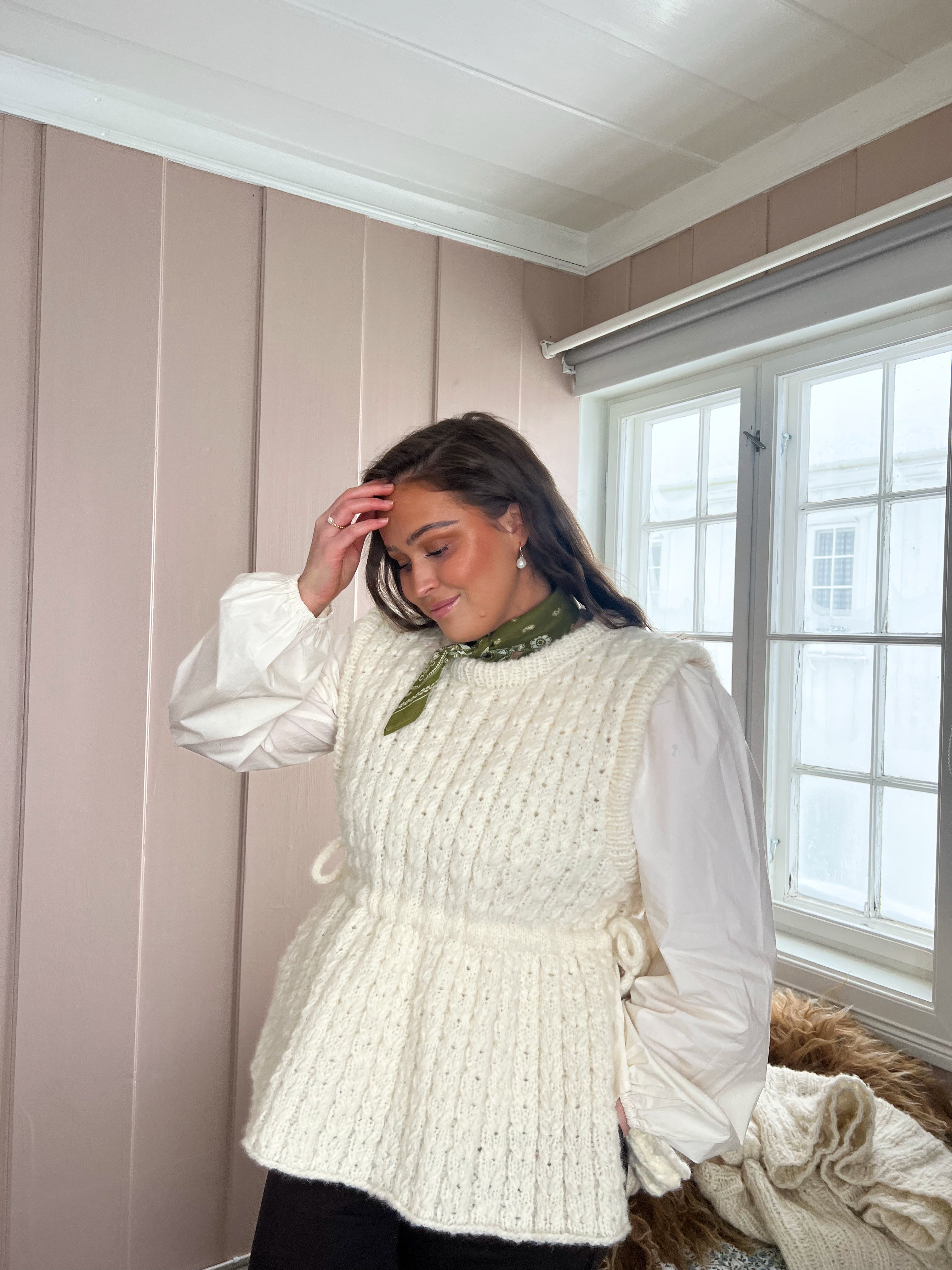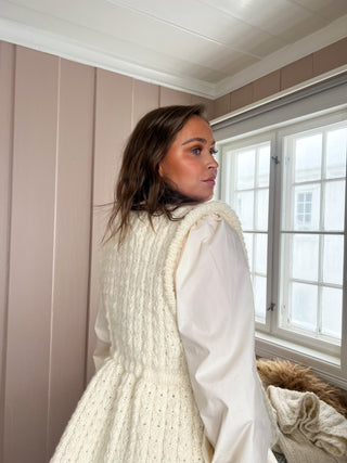 Vesten er strikket i Myk Norsk Lamull i fargen 3001 Naturhvit.