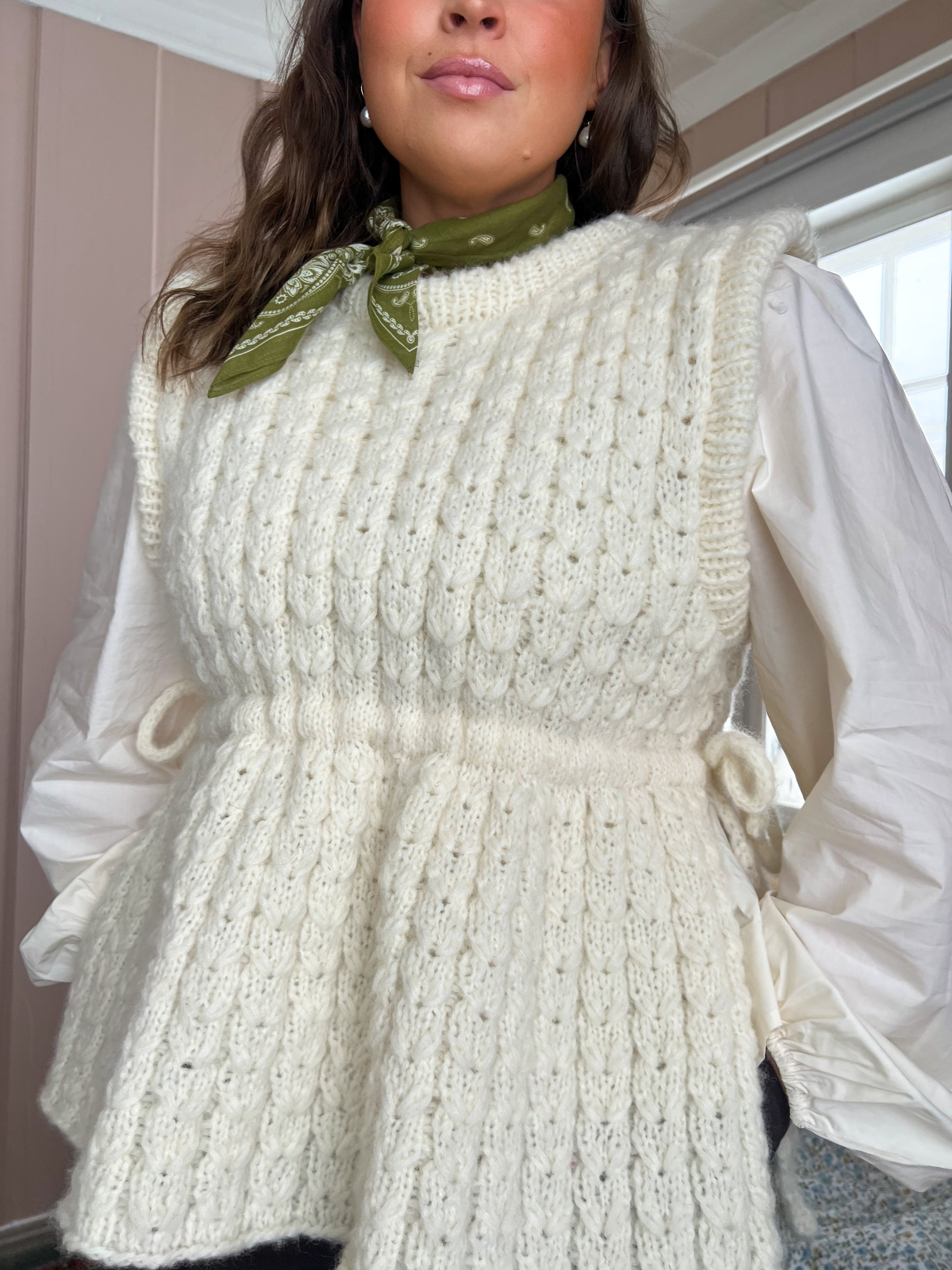 Vesten er oppkalt etter et av naturens skjønnheter, Kornblomsten. Jeg ønsket å designe en vest som både er søt men også har litt edge. Jeg savnet et strikkeplagg som kan pynte opp et antrekk. Vesten er lun og varm, og passer perfekt over en skjorte eller bluse. Et perfekt statement piece. Jeg kommer til å bruke min på kontoret, akkurat passe søt og edgy.