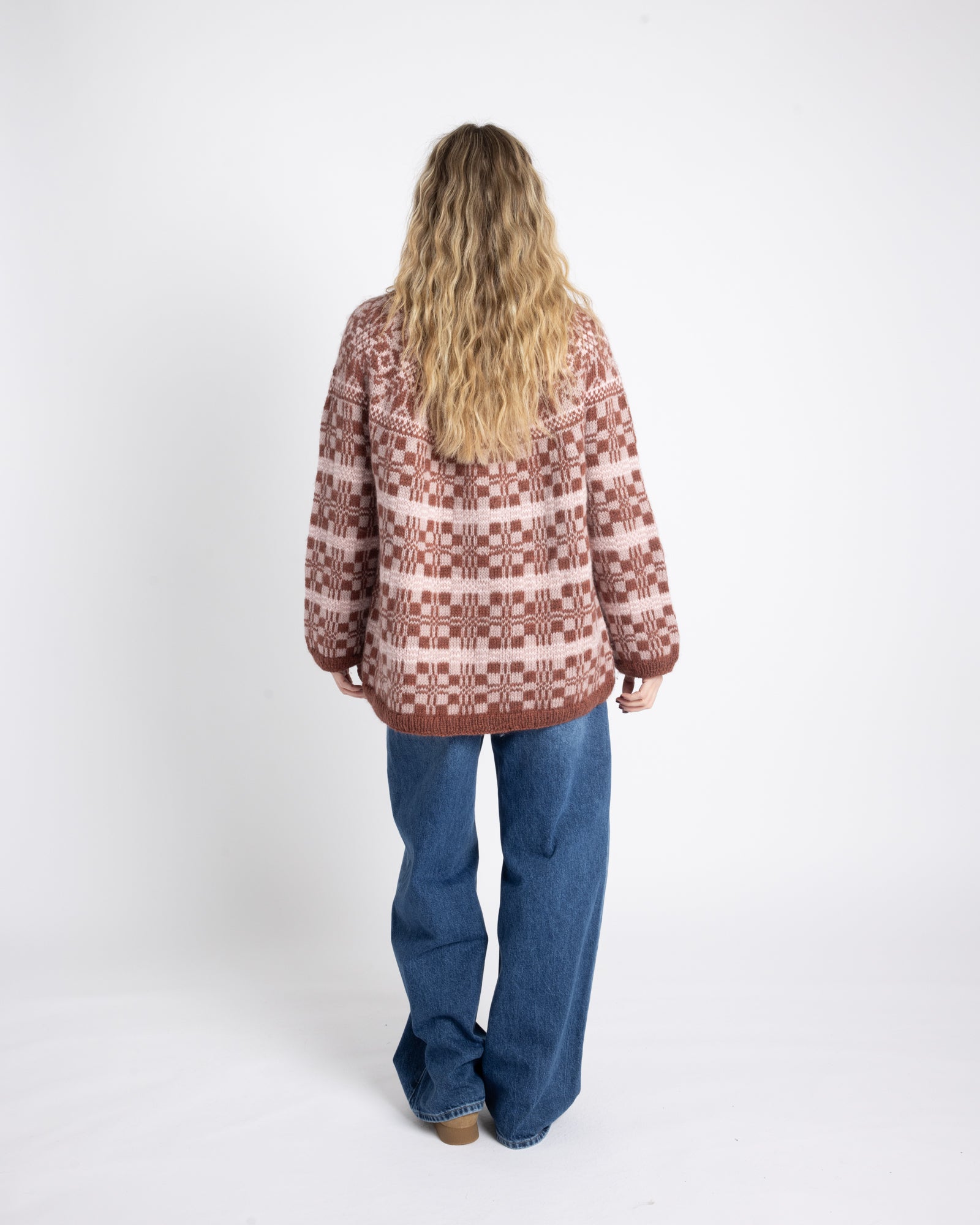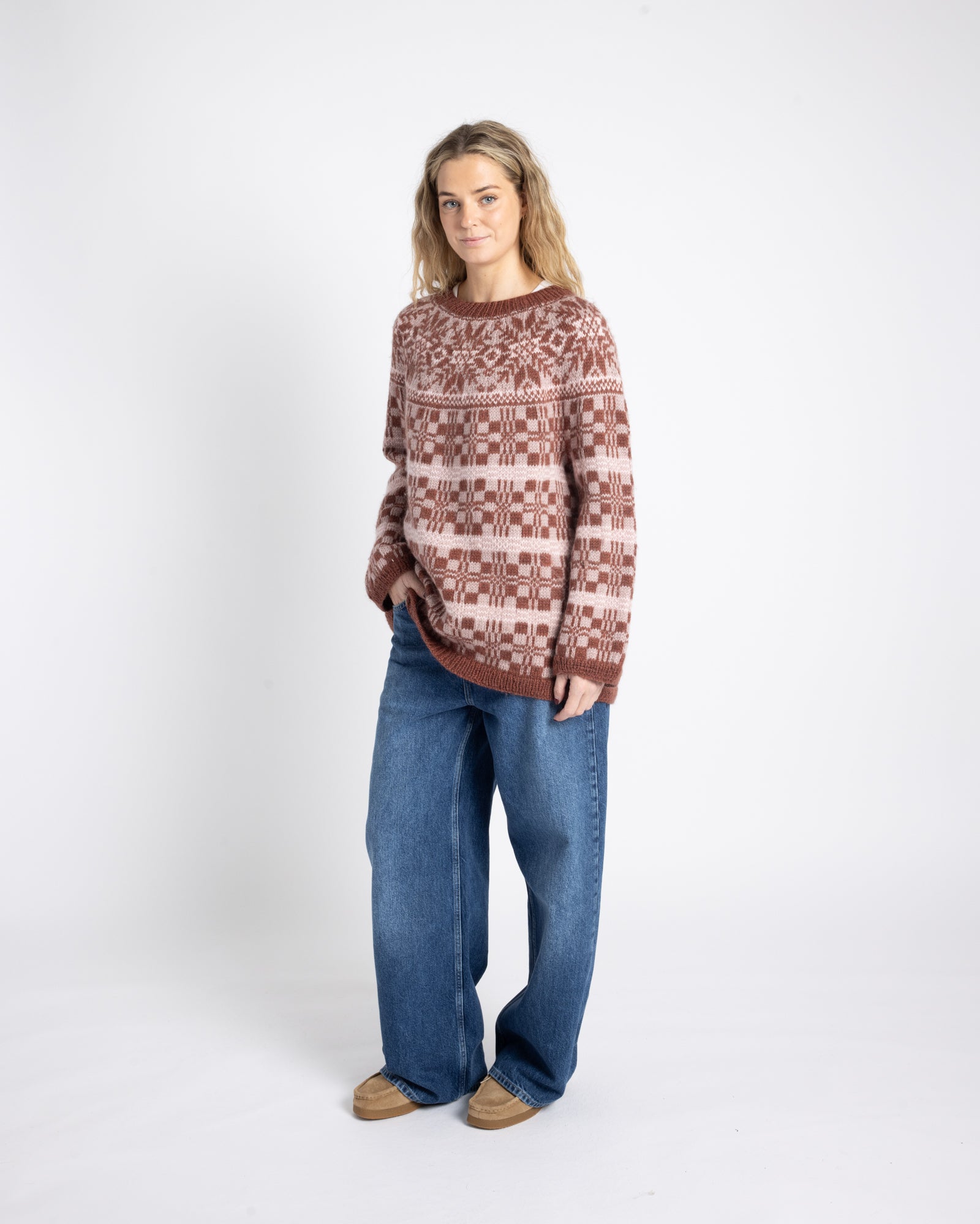 Lilly er en mønstret genser strikket i vårt Spinnvill-garn. Den strikkes med rundfelling og har en rett passform.