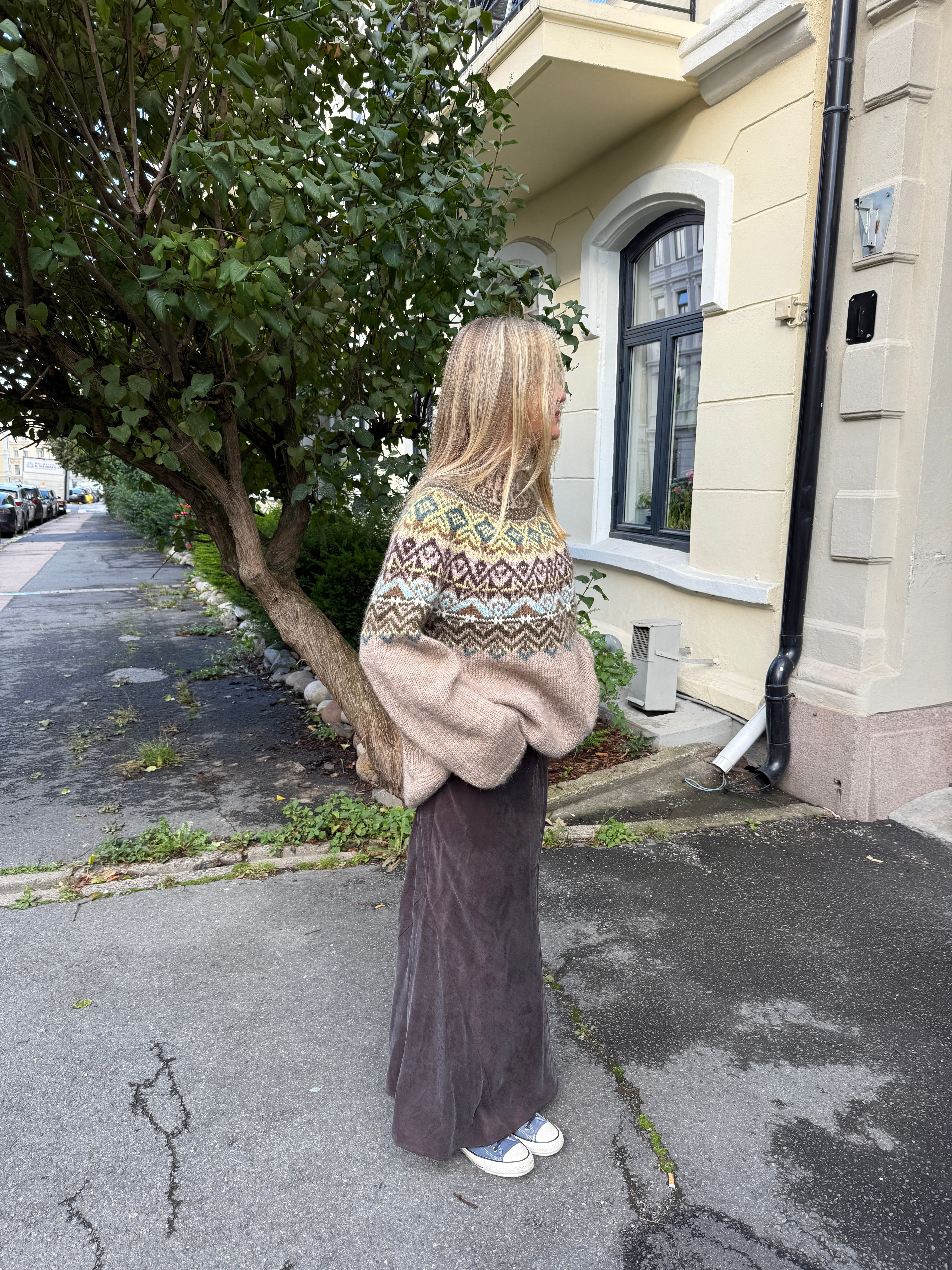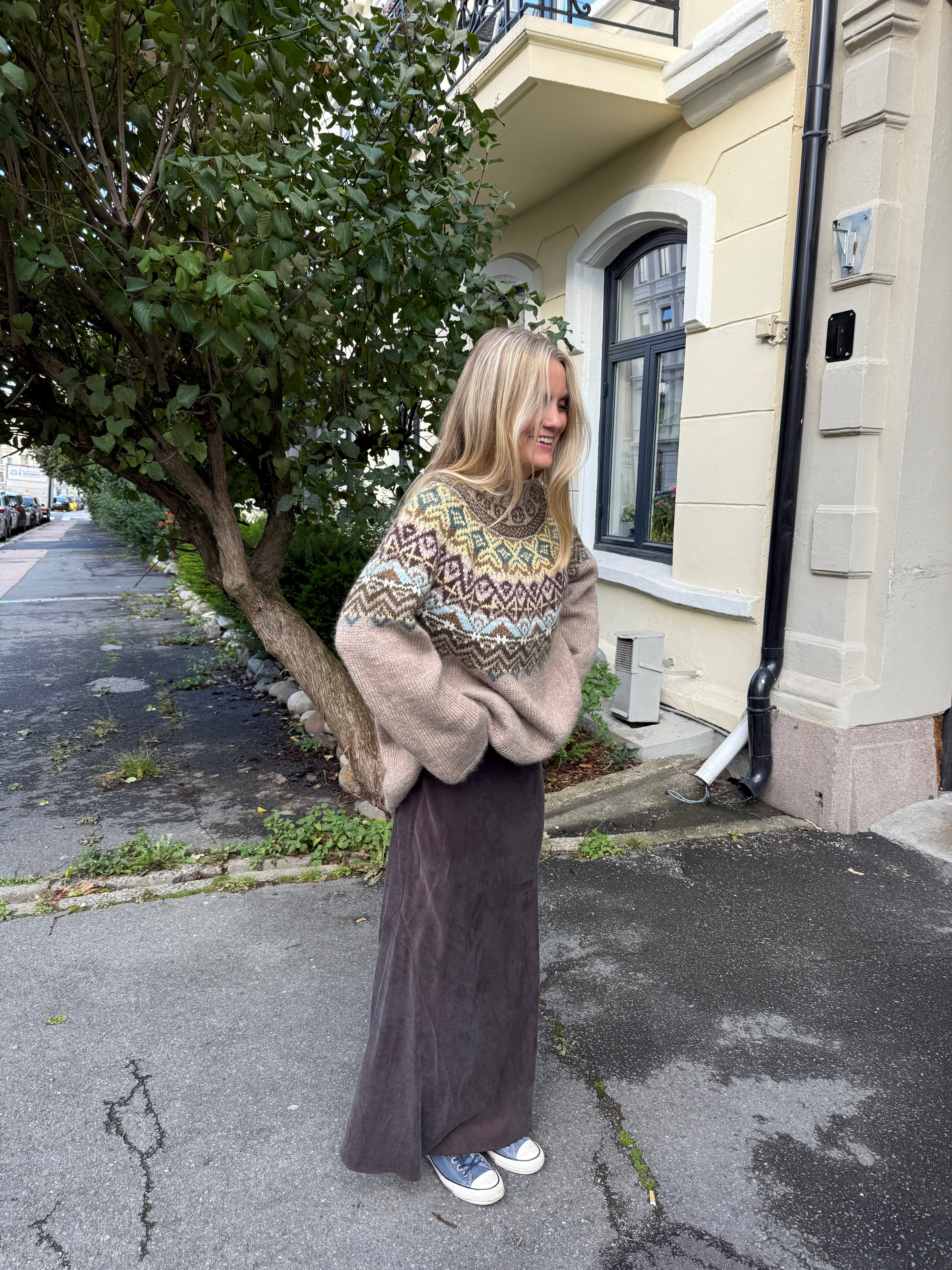 Genseren er strikket i Spinnvill Norsk Lamull i fargene 5002 Mørk Sandmelert, 5001 Naturhvit, 5007 Mint, 5008 Petrolgrønn, 5009 Mosegrønn, 5010 Mocca, 5011 Pudderrosa, 5015 Ørkenbrun og 5017 Solstråle.