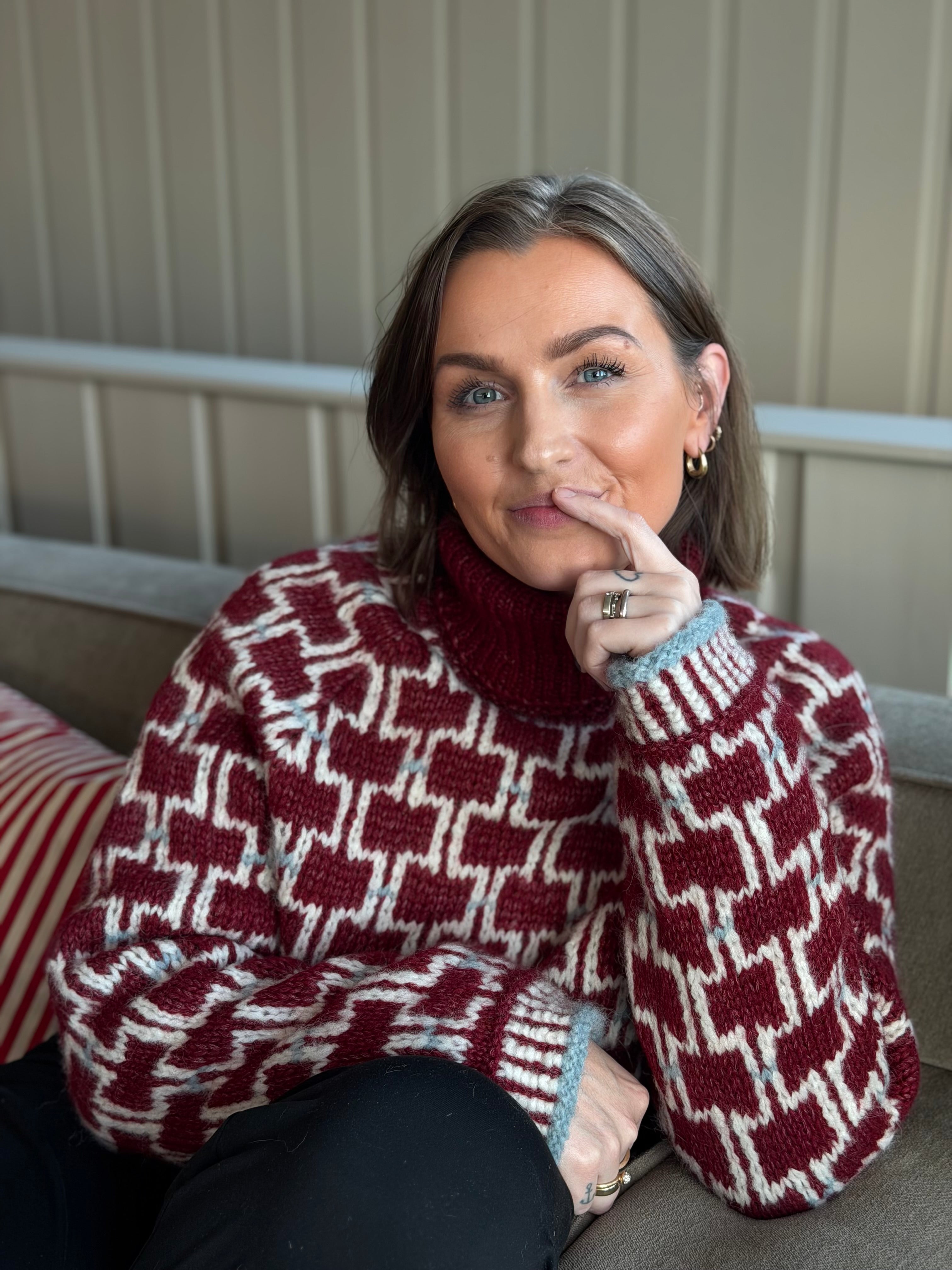 Genseren er strikket i Myk Norsk Lamull i 3033 Kardinalrød, 3001 Naturhvit og 3007 Mint.