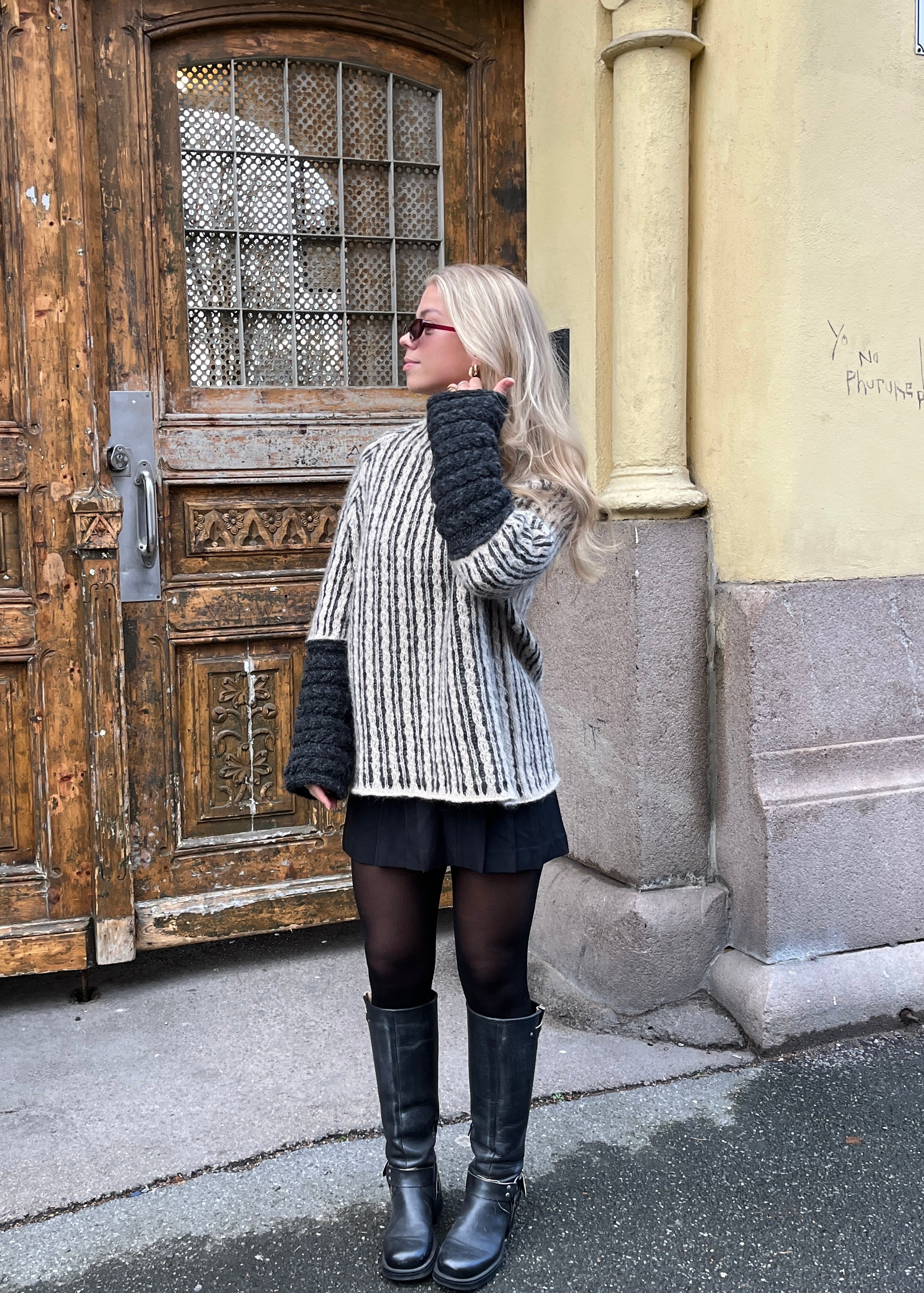Yndling er en luftig genser som kombinerer strukturstrikk med falske fletter og mønsterstrikk med striper i to farger.